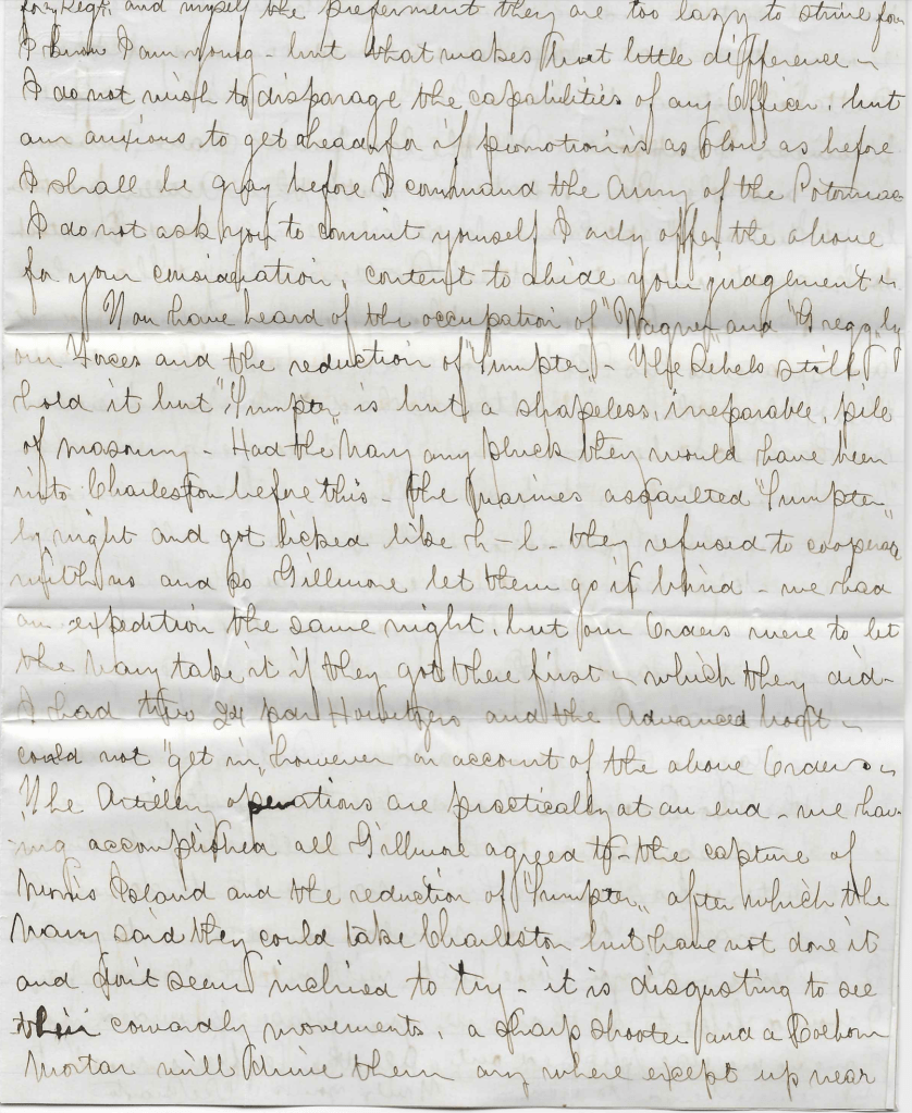 You have heard of the occupation of [Forts] Wagner and Gregg by our forces and the reduction of “Sumpter.” The rebels still hold it but “Sumpter” is but a shapeless, irreparable pile of masonry. Had the Navy any pluck, they would have been into Charleston before this. The Marines assaulted “Sumpter” by night and got licked like hell. They refused to cooperate with us and so Gillmore let them go it blind. We had an expedition the same night but our orders were to let the Navy take it if they got there first, which they did. I had the 24 pounder Howitzers and the Advanced boat. Could not “get in” however on account of the above order. The artillery operations are practically at an end—we having accomplished all Gillmore agreed to—the capture of Morris Island and the reduction of “Sumpter” after which the Navy said that they could take Charleston but have not done it and don’t seem inclined to try. It is disgusting to see their cowardly movements. A sharpshooter and a Coehorn Mortar will drive them anywhere except up near the Rebel Batteries and we have not any ordnance here heavy enough to do that.