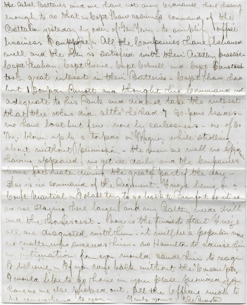We have lost but few—none by carelessness. One of Co. “M” blown up by a torpedo on “Wagner” while strolling about without permission. The men are well. No epidemic having appeared. We get ice daily and the companies have ice water during the greater part of the day. Day is in command of the regiment, Frieze being on a court martial. I shall try to go back to Beaufort as it is no use staying here longer and my Battery needs drill, and the horses rest. Now is the time to start Frieze. All are disgusted with him. It will be a popular move no matter who succeeds him. No Hamilton to advise him. An intimation from you would cause him to resign, I believe. If you come back without the “conscripts,” I would like to go home in your place provided you have no one else picked out. All the officers wish to be remembered to you.