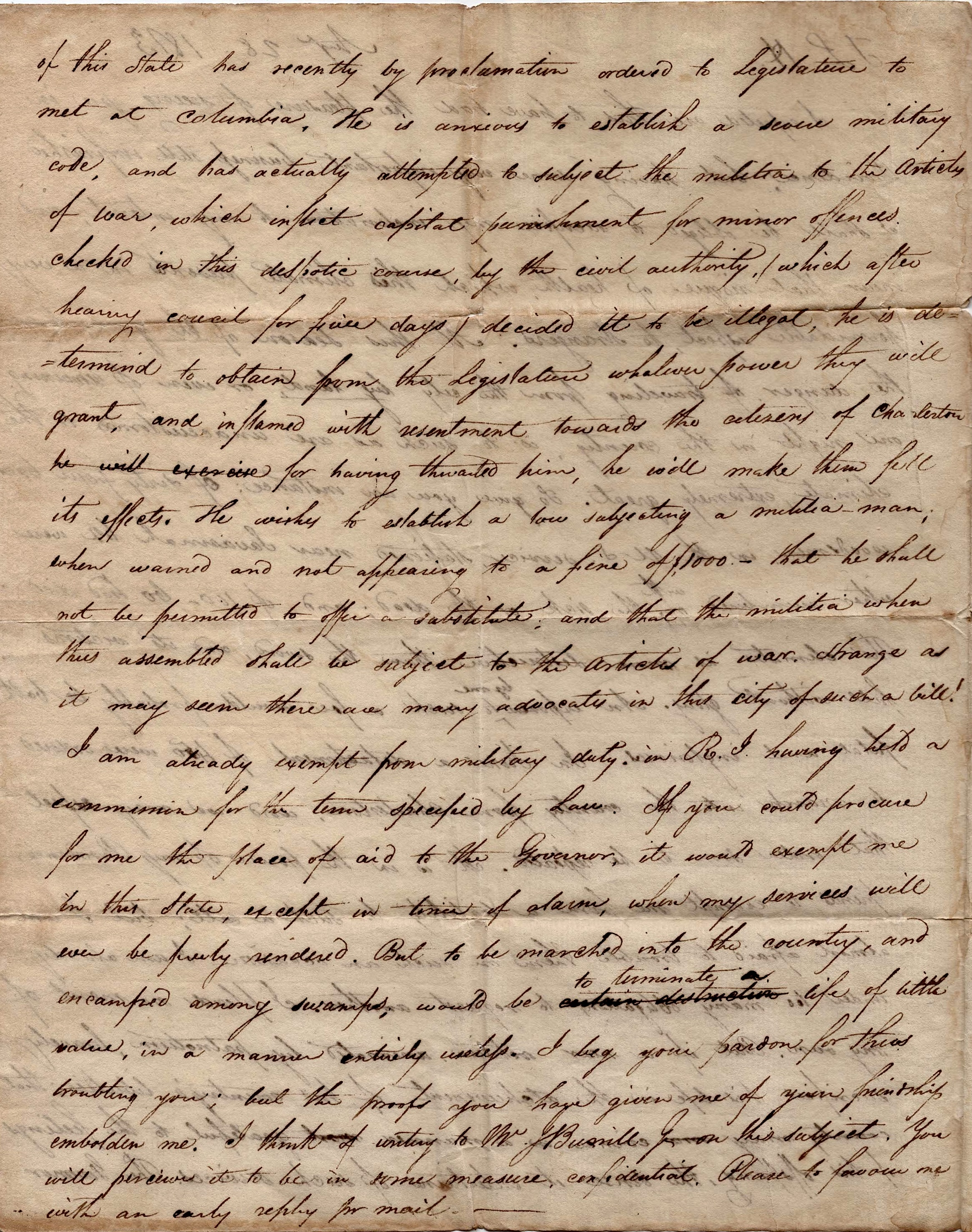 The Governor of this state has recently by proclamation ordered the Legislature to meet at Columbia. He is anxious to establish a severe military code and has actually attempted to subject the militia to the Articles of War, which inflict capital punishment for minor offenses. Checked in this despotic course by the civil authority (which after hearing council for five days) decided it to be illegal, he is determined to obtain from the Legislature whatever power they will grant and inflamed resentment towards the citizens of Charleston for having thwarted him. He will make them feel its effects. He wishes to establish a law subjecting a militia man, when warned and not appearing to a fine of $1000 that he shall not be permitted to offer a substitute and that the militia when thus assembled shall be subject to the articles of war. Strange as it may seem, there are many advocates in the city of such a bill!