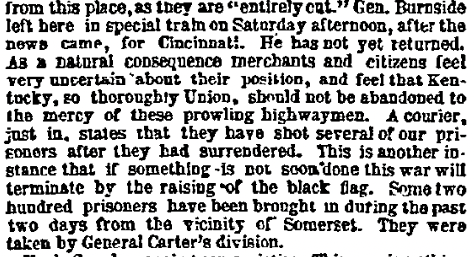 I seen John Ward from Birmingham this day week. He had been taken prisoner at Richmond and was paroled. I have not seen anything of Hayes’ Boys or Logan’s nor I don’t know where their regiment is.