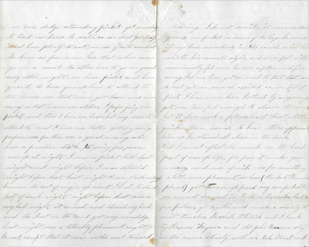 We are all well in Company F that you are acquainted with. [George] Wasin is as well as usual and the whole company as a general thing is well. Wasin sends his respects to all his friends. The next time you write, let me know if Joe Irvin went to Fort Delaware or not and let me know what George Young and Jacob Miller is doing and how they are getting along. And if George has a notion of coming out as a substitute for any of the drafted boys. This company, without exceptions, was glad to hear of Pont Irvin being drafted. We are very well satisfied that we came into an old regiment for we are not half so hard drilled as the new ones and we are not bound down like them. We can leave camp when we please while they have to get a pass to go outside of theirs. We can go out for one mile without one.