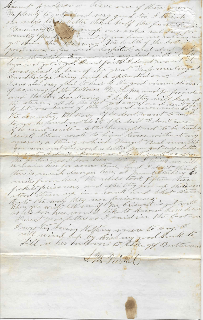 This is a hard place. I can’t say I like soldiering but I like it as well as I expected I would, But if God spares me, I will come home. God is my support in this time of trouble. May God bless us all and bless the whole world and save us all and if we never meet in this world, may we meet in Heaven at last is my prayer.