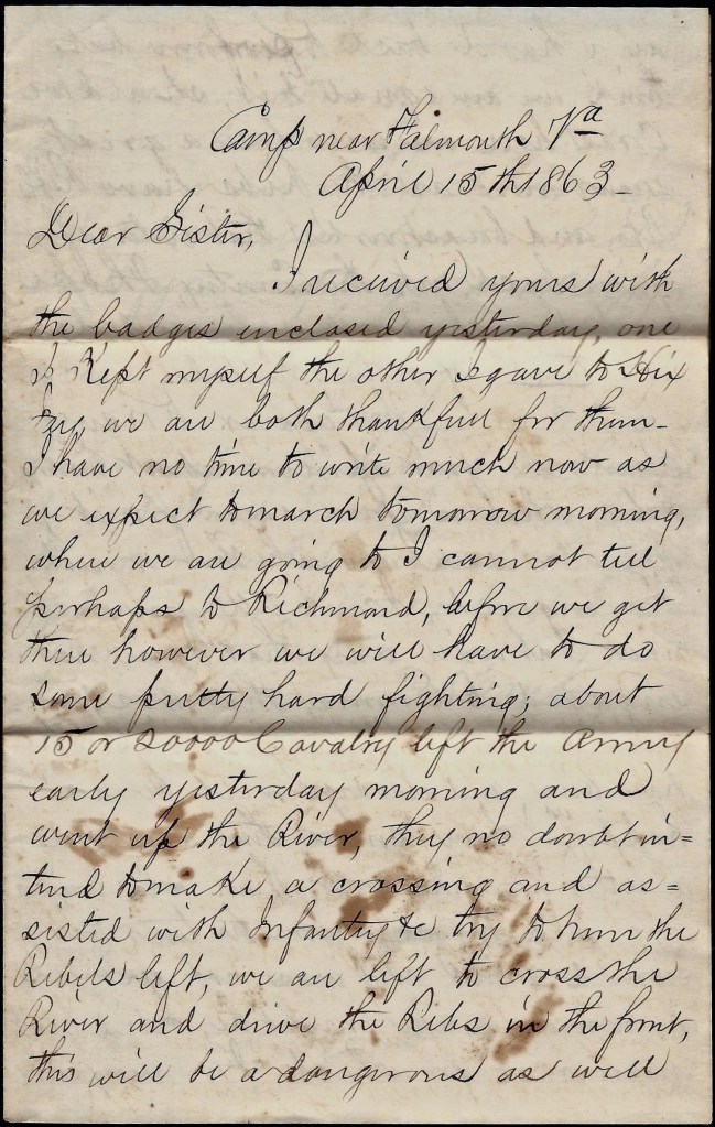 Well, what shall I write to you about this time? I wrote to you the first of the week but I got a good letter from you last night and I cannot but answer it this morning. We are now in our new camp but probably shall not be here a week from today. Our Corp have orders from Gen. Hooker to do guard duty on the railroad running from Falmouth to Acquia Creek. We expect to go every day but we do not know the exact day we shall go. I hope it will be a good job for I am getting tired of this life while we are having such hot weather. We have to drill in the morning and afternoon and I think it is a little too hot for such work.
