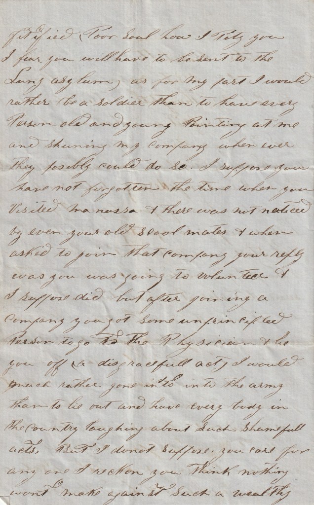 It was thought when the militia was called, you would certainly be dragged out. But you even lied out of that. I declare, it is shameful. I understand you were almost frightened to death when the militia was called out. How are you getting along by this time? But I suppose very well since you have led enough to get a discharge. It surprised me when I heard that you fitified 1 (Poor soul, how I pity you. I fear you will have to be sent to the lung asylum).