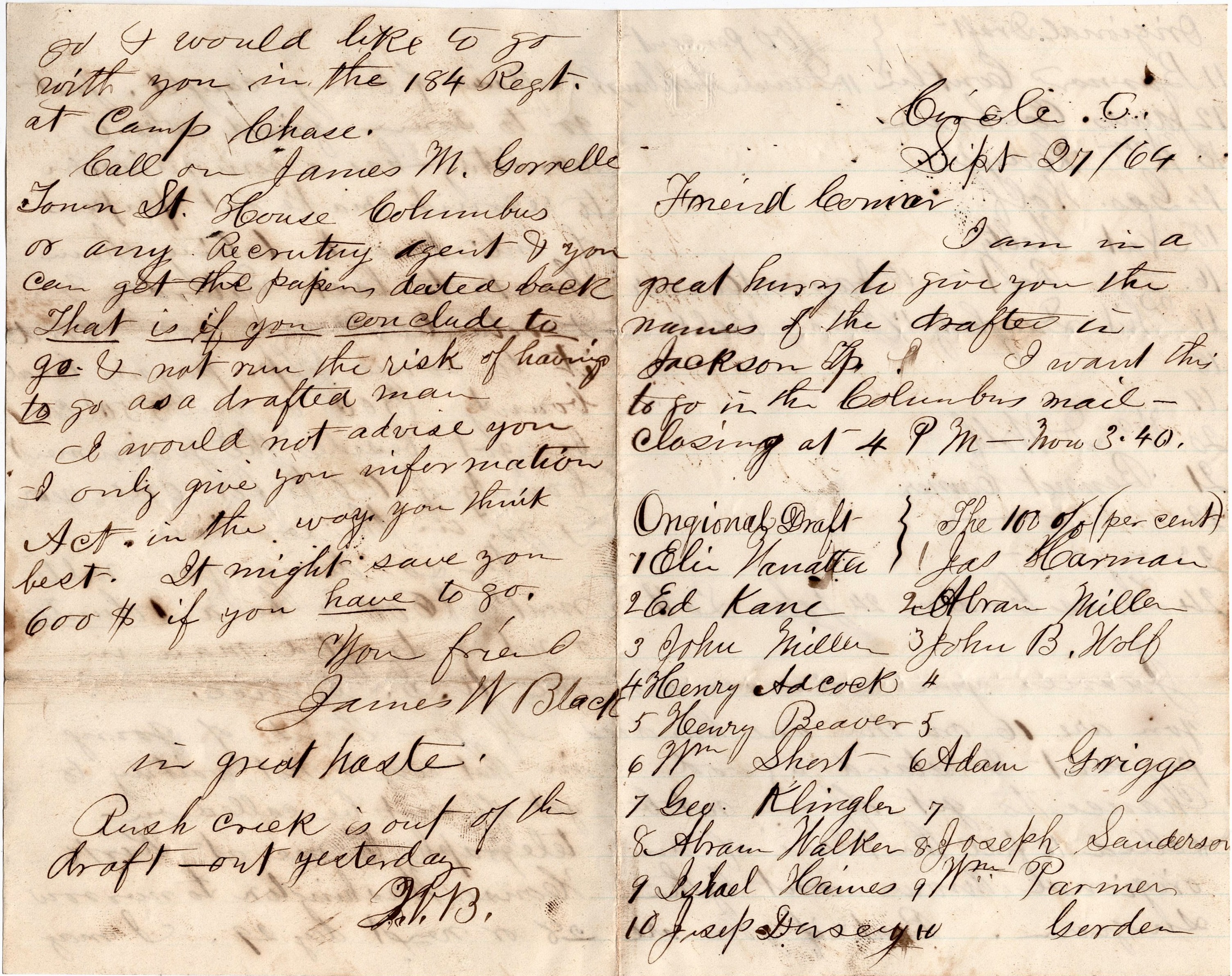 The following letter was written by James W. Black to his friend James Conner advising him of the names of those age eligible individuals selected in the 1864 draft in Pickaway county, Ohio. He suggests that his friend may want to ask a recruiter to back date enlistment papers for him as a volunteer in order to collect a hefty bounty rather than report as a draftee and receive no bounty.