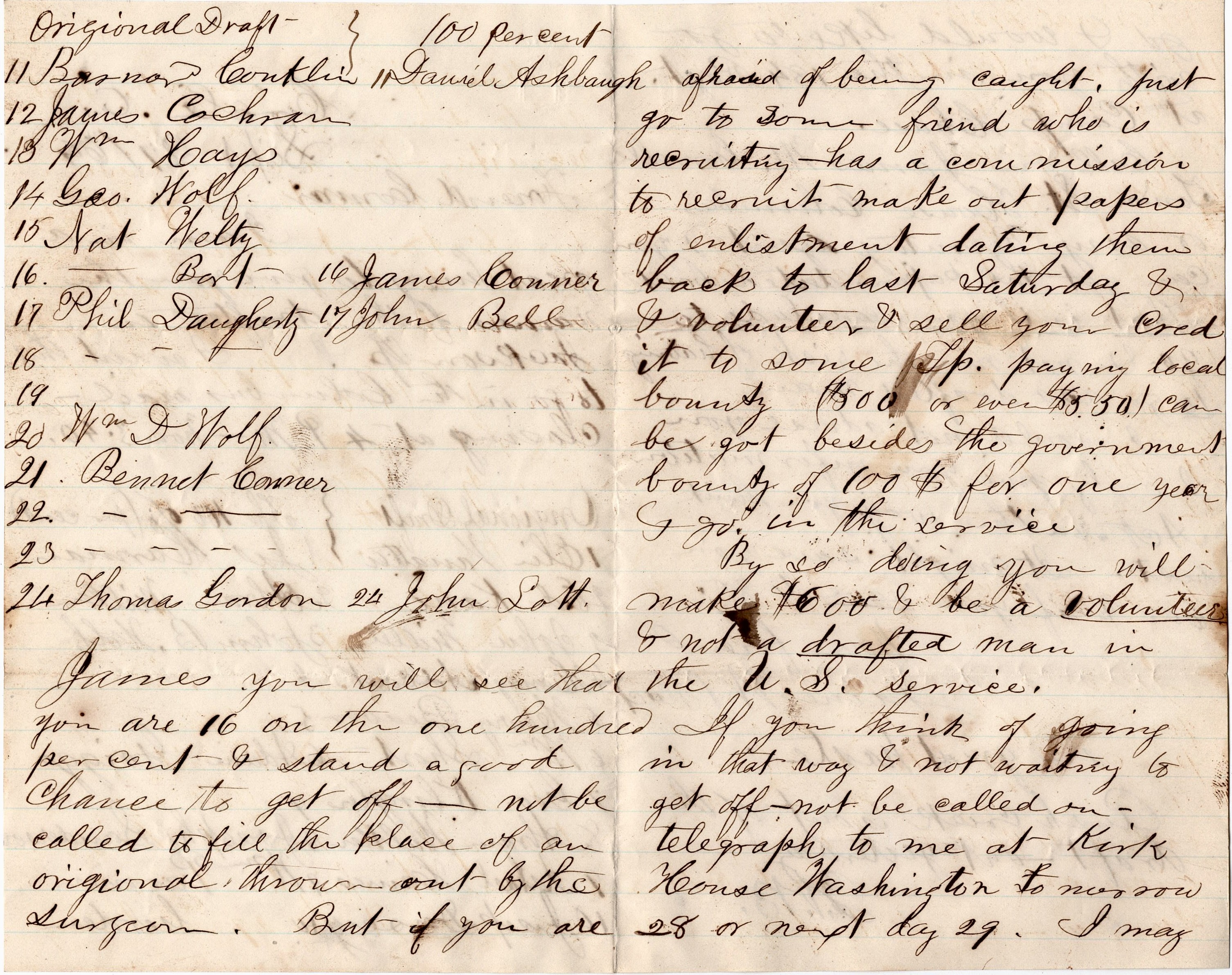 James you will see that you are 16 on the one hundred per cent & stand a good chance to get off- not be called to fill the place of an original throw out by the surgeon. But if you are afraid of being caught, just go to some friend who is recruiting, has a commission to recruit, make out papers of enlistment dating them back to last Saturday, & volunteer & sell your credit to some township paying local bounty ($500 or even $550) can be got besides the government bounty of $100 for one year & go in the service. By so doing you will make $600 & be a volunteer & not a drafted man in the U. S. service.