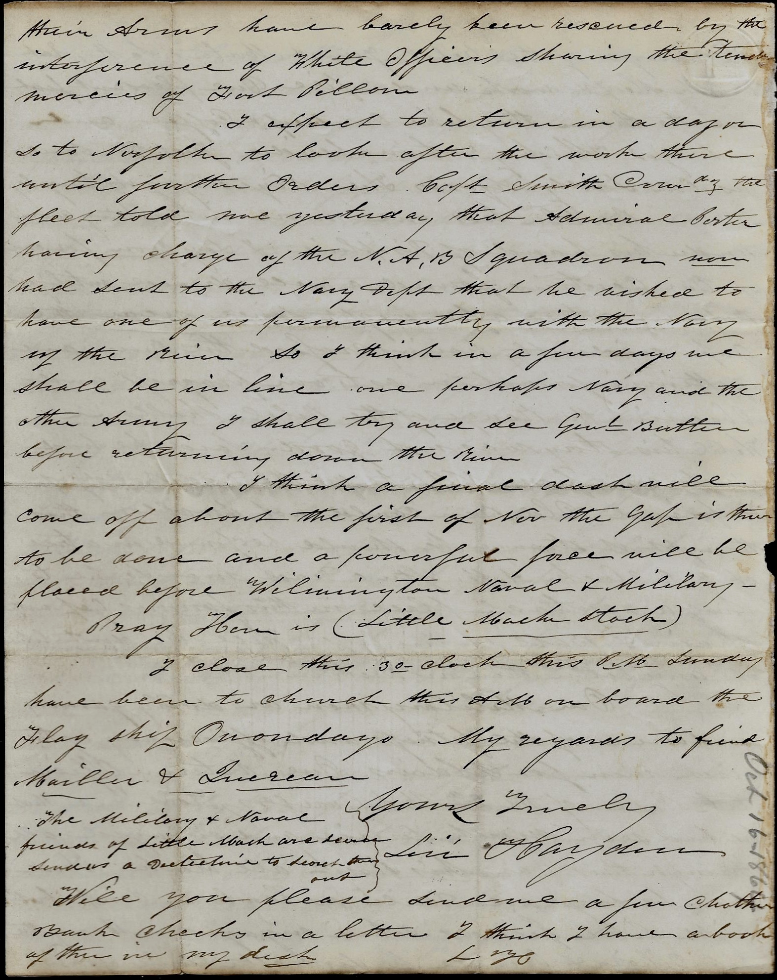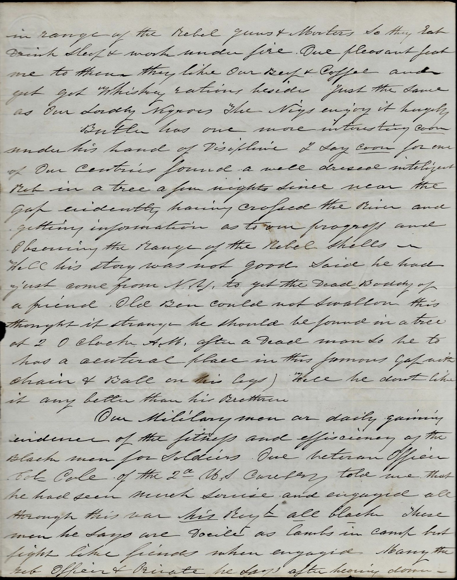 Thursday, 26—Clear & rather cold, wind west. Was on detail cutting spiles in forenoon. Remained in camp in p.m. & did my washing. There is but little firing today from gunboats. Received a letter from home last night.