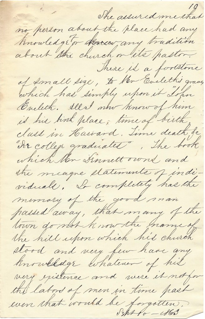 There is a footstone of small size to Mr. Eveleth’s grave which has simply upon it “John Evelith.” All I now know of him is his birth place, time of birth, class in Harvard, time of death, &c. “See college graduates” [in] the book which Mr. Dennett owns and the meagre statements of individuals. So completely has the memory of the good man passed away that many of the town do not know the name of the hill upon which his church stood and very few have any knowledge whatever of his very existence and were it not for the labors of men in time past even that would be forgotten. September 10, 1863.