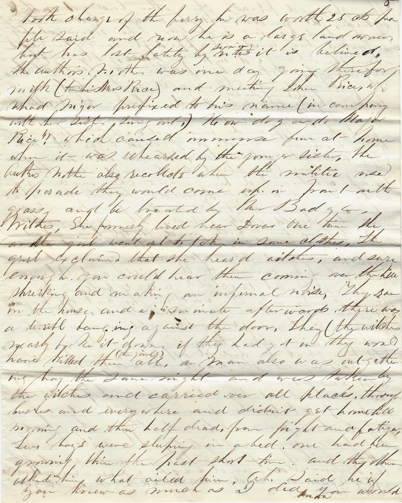 At the old ferry (by Mrs. Rice’s at present), Mrs. Rice used to have an parrot who would call people all kind of names. When Mr. John Rice [1788-1871] took charge of the ferry, he was worth 25 cents, people said, and now he is a large land owner, but has lost lately by signing notes it is believed. The author’s mother was one day going there for milk (to Mrs. Rice) and meeting John Rice who had major prefixed to his name (in company with her sister) sung out. “How do you do Major Rice!” which caused immense fun at home when it was rehearsed by the younger sister. The author’s mother also recollects when the militia used to parade, they would come up in front on the grass and be treated by the Badger witches. She formerly lived near Dover. One time she and another girl went to take in some clothes, the girl exclaimed that she heard witches, and sure enough, you could hear them coming over the hill shrieking and making an infernal noise. They ran in the house and a minute afterwards there was a terrible  banging against the door. They (the witches) nearly broke it down. If they had got in, they would have killed them all (the girls). A man also was out gathering hay the same night and was taken by the witches and carried over all places, through bushes and everywhere and didn’t get home till morning and then half dead from fright and fatigue.