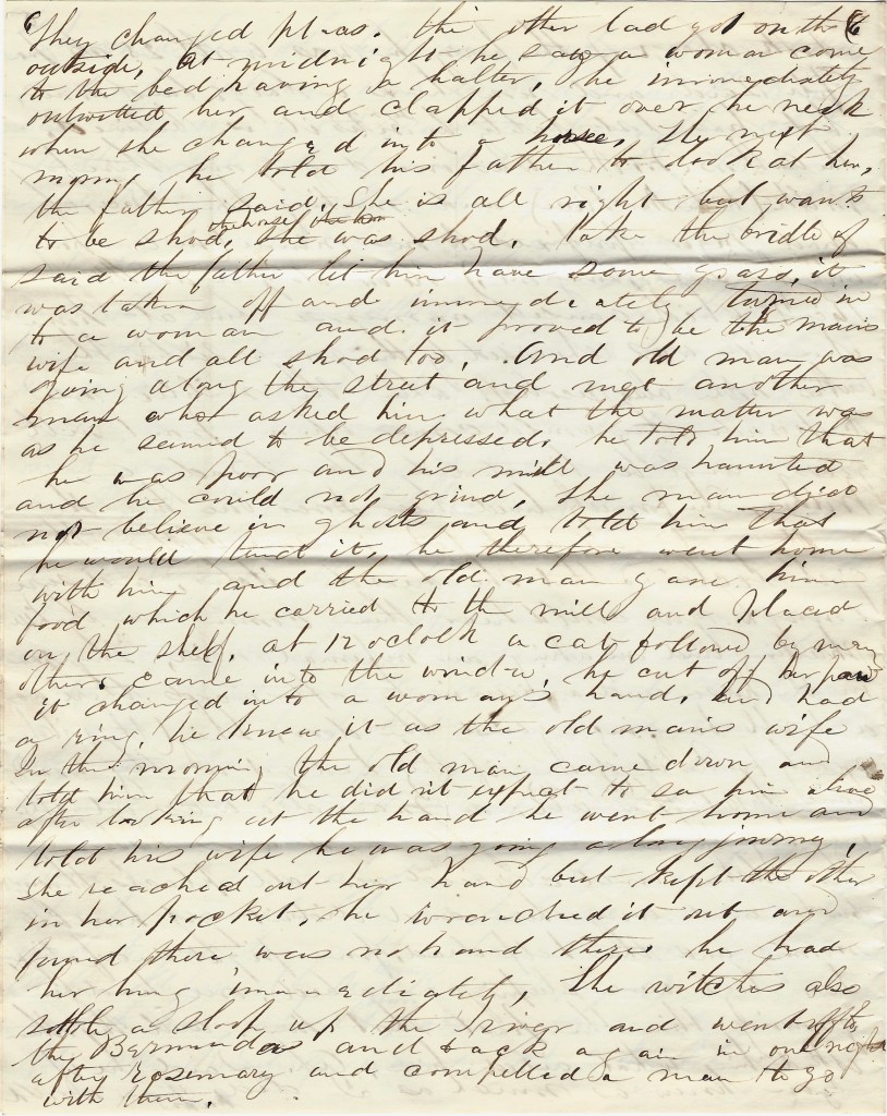 An old man was going along the street and met another man ad asked him what the matter was as he seemed to be depressed. He told him that he was poor and his mill was haunted and he could not grind. The man did not believe in ghosts and told him that he would tend it. He therefore went home with him and the old man gave him food which he carried to the mill and placed it on the shelf. At 12 o’clock, a cat followed by many others came into the window. He cut off her paw. It changed into a woman’s hand and had a ring. He knew it was the old man’s wife. In the morning the old man came down and told him that he did not expect to see him alive. After looking at the hand, he went home and told his wife he was going on a long journey. She reached out her hand but kept the other in her pocket. He wrenched it out and found there was no hand and there. He had her hung immediately. The witches also sailed a sloop up the river and went off to the Bermudas and back again in one night after rosemary and compelled a man to go with them.