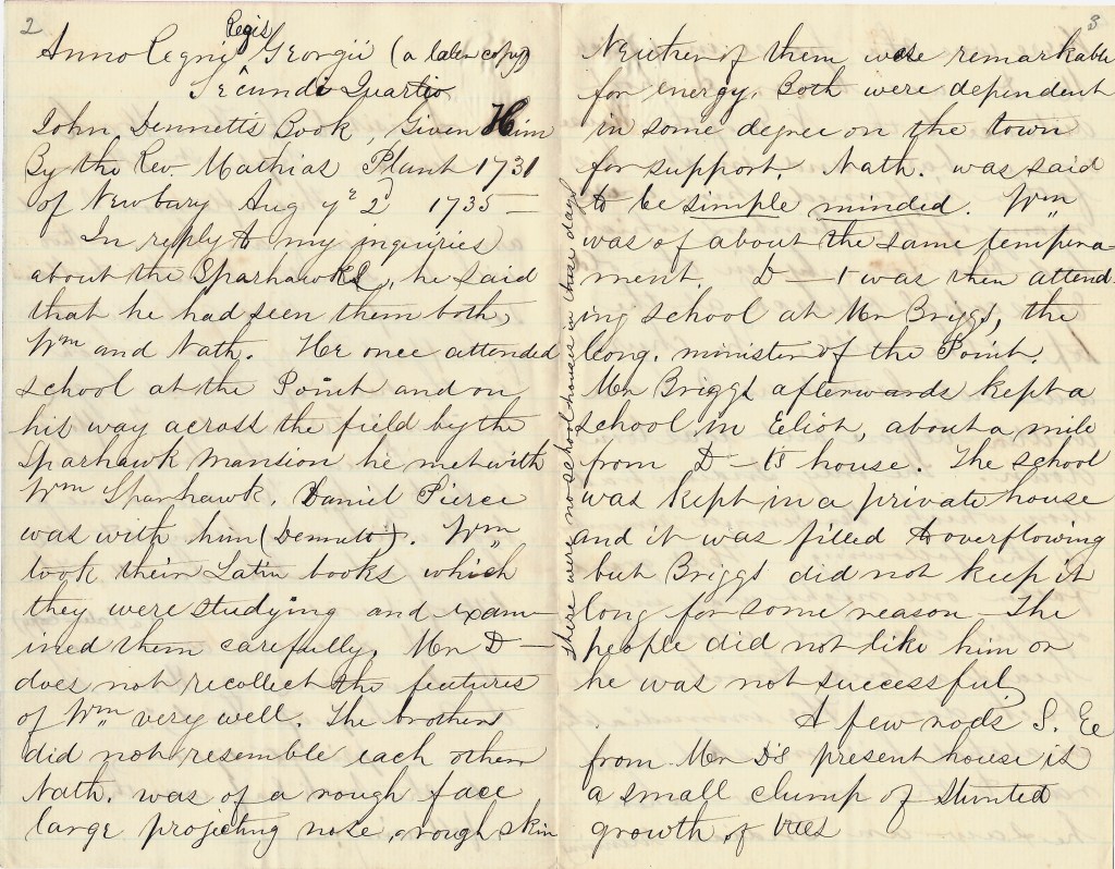 In reply to my inquiries about the Sparhawks, he said that he had seen them both, William and Nathaniel. He once attented school at the Point and on his way across the field by the Sparhawk mansion he met with William Sparhawk. Daniel Pierce was with him (Dennett). William took their Latin books which they were studying and examined them caregully. Mr. Dennett does not recollect the features of William very well. the brothers did not resemble each other. Nath. was of a rough face, large projecting nose, and rough skin. Neither of them was remarkable for energy. Both were dependent in some degree on the town for support. Nath. was said to be simple minded. William was of about the same temperament.
