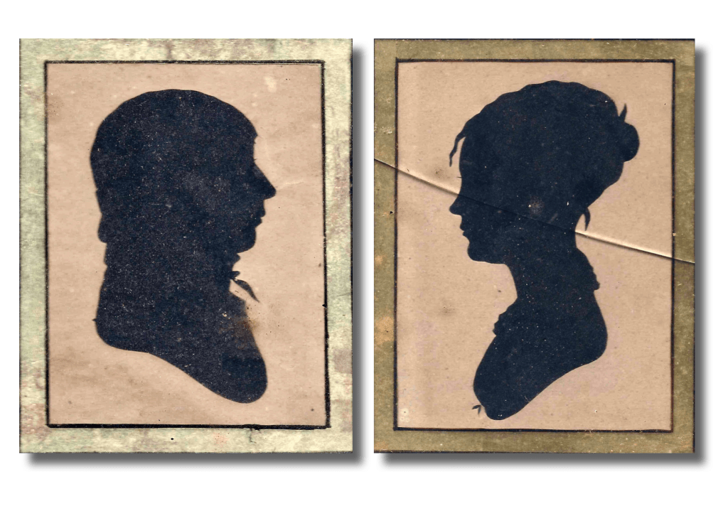 Silhouette Images of Mark Dennett (1786-1883) and his wife Alice Wilson (1785-1819). The couple were married in 1808 so these silhouettes may have been made about that time. Both were born and died in Kittery, York county, Maine.