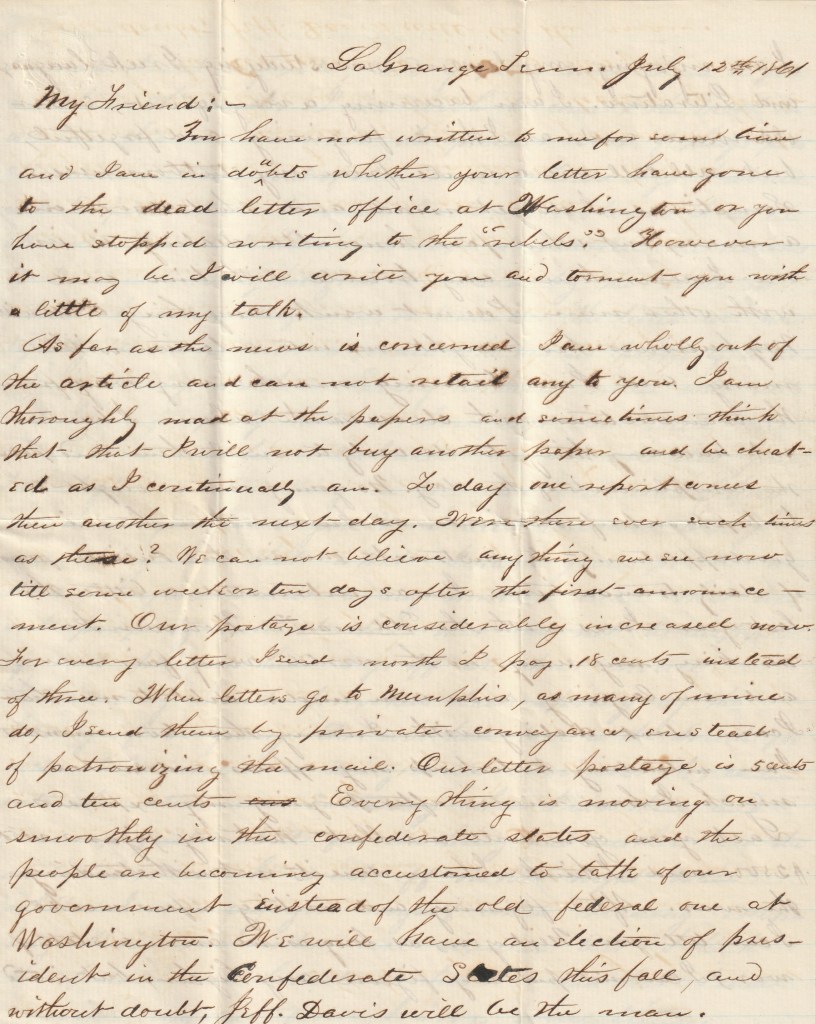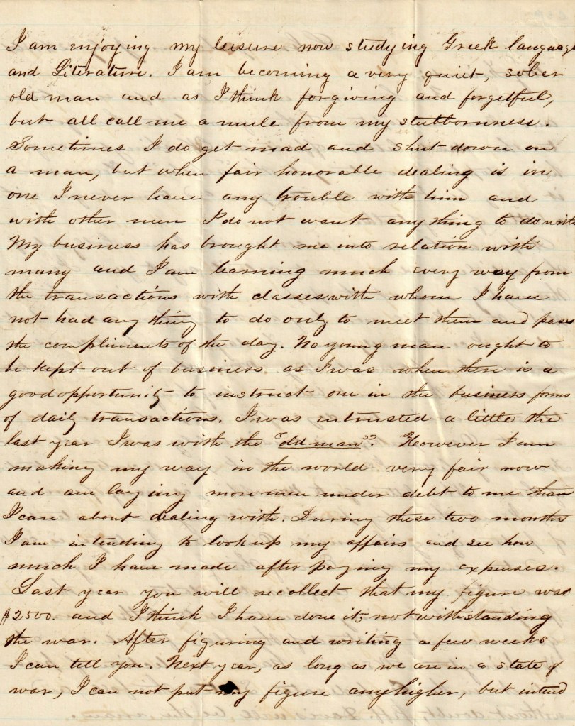 I have rented your place to a Dr. Harrold for $50 dollars until the 1st day of January 1862. The price may appear small but it was the best I could do adn I thought it better to have someone to cultivate it and take care of it at a low rent than it should go to ruin. Lott will take care of Will’s things. subject to your order. He has the cows on his place. You need not pay anything on your place this year. There is a stay law which prevents executions. Dorr refuses to pay that note. We are all well and send our love to you and your families. Yours, &c. — B. D. Carpenter