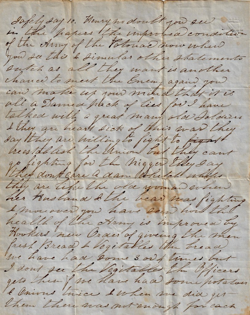 The message of Gov. Seymour of New York is greeted among the soldiers. It is hailed with delight and calculated to inspire us to fight with more vigor when we know what we are fighting for. The question may be asked what we are battling for and we must say to free the nigger, to enrich contractors, and making generals. While look on the other side. Ask the rebels what they are fighting for. Answer—our homes, our property and our lives. At the beginning of this war, I thought we were fighting for the Union as it was. Not so now. Well, let all that pass.