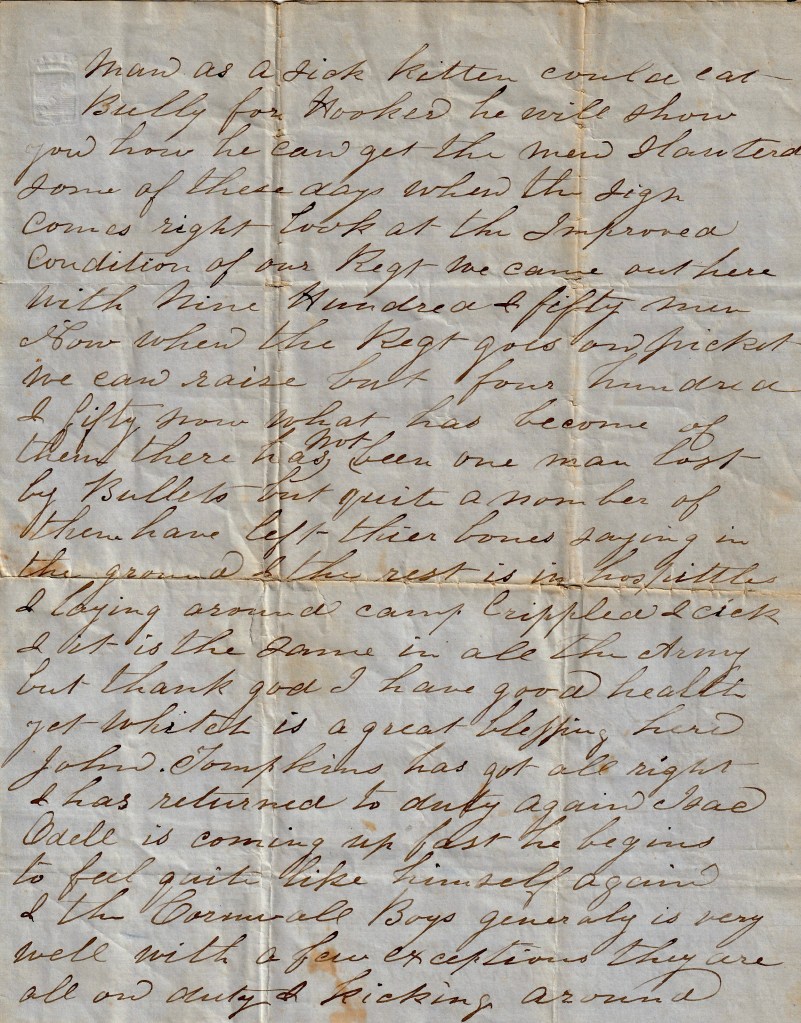 When I see you which I hope to some day if I don’t be unfortunate like many other comrades who fell on some of the many battlefields which our regiment has been engaged in, I will then talk to you and tell you how I have suffered. Yet I am willing to suffer more in a just cause—to have the Union as it was.