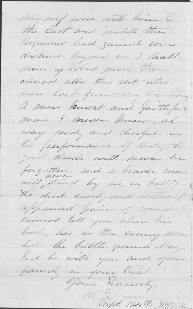 Well, I almost forgot to tell you that I ran across the 137th Pennsylvania Reserves and saw all the boys. They were burying the dead. I suppose they will send you all particulars. I also saw several of the 45th today. None of the boys from Equinunk got killed. Several got wounded.