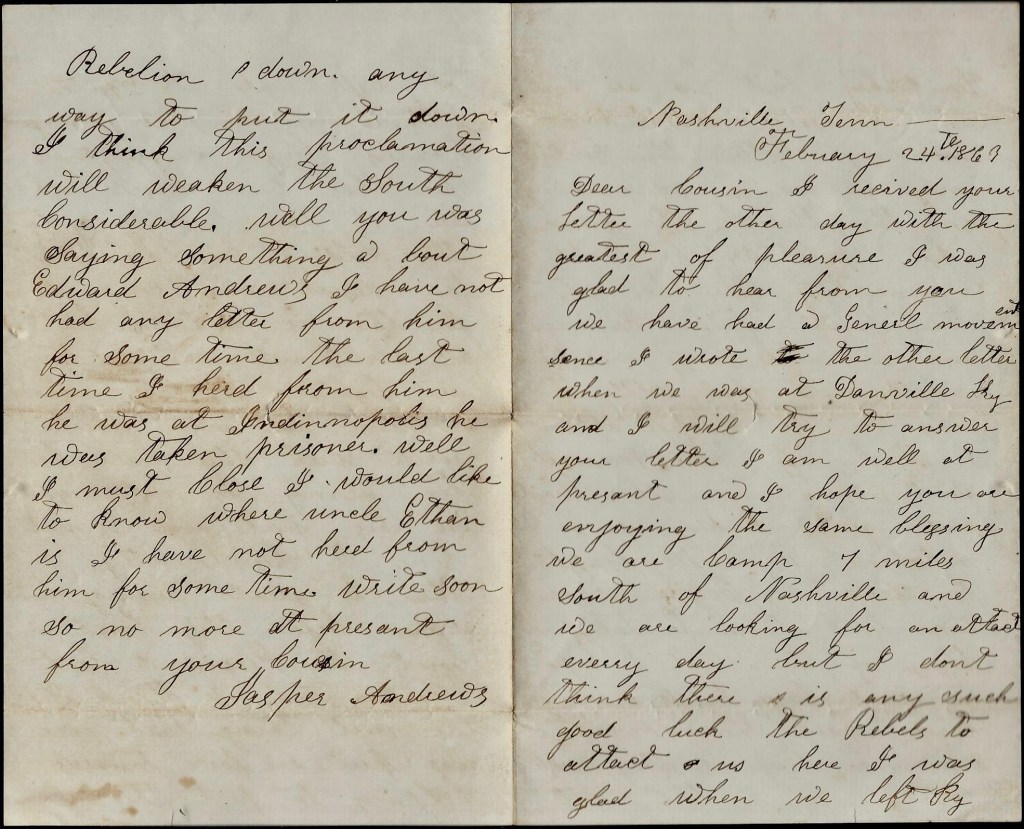 The second letter was penned after the Battle of Fredericksburg and following Lincoln’s Emancipation Proclamation. It is more philosophical in nature. The third letter (partial) probably dates to March 1863.