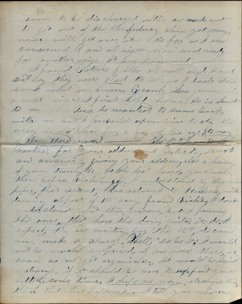 I found Father’s folks all well and I need not say they were glad to see me. I took them somewhat unawares. [My brother] Frank has grown like a weed since I first left home. He is about to my shoulders. He wanted to come back with me but I prevailed upon him to stay. The army is no place for a boy at his age (too many of them there now).