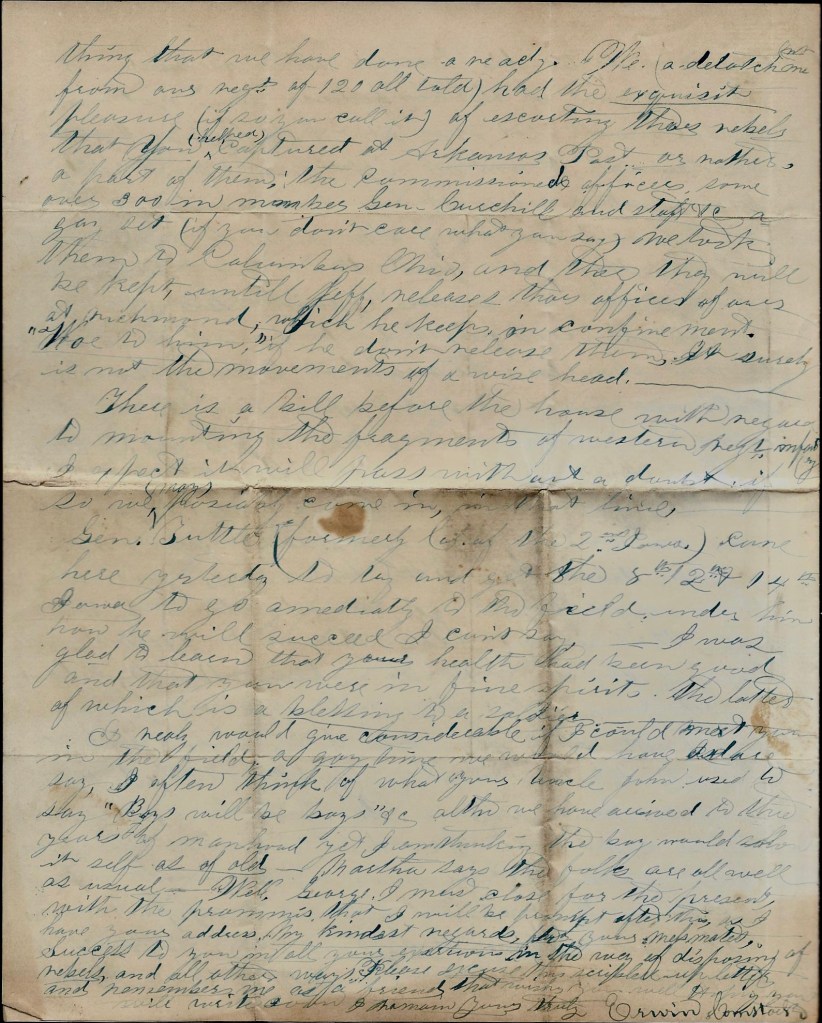 I really would give considerable if I could meet you in the field. A gay time we would have, I dare say. I often think of what your Uncle John use to say, “Boys will be boys,” &c. Although we have arrived to the years of manhood, yet I am thinking the boy would stay itself as of old. Martha says the folks are all well as usual. Well, George, I must close for the present with the promise that I will be prompt after this as I have your address. My kindest regards to your messmates. Success to you in all your exertions in the way of disposing of rebels, and all other ways. Please excuse this scribbled up letter and remember me as a friend that wishes you well. Hoping you will write soon, I remain yours, truly, — Erwin Comstock