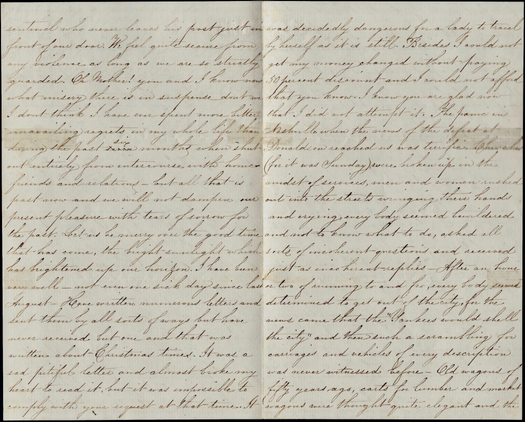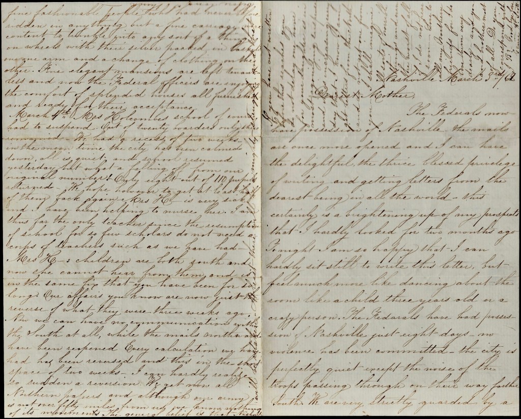 The Federals have had possession of Nashville just eight days. No violence has been committed. The city is perfectly quiet except the noise of the troops passing through on their way farther South. We are very strictly guarded by a sentinel who never leaves his post just in front of our door. We feel quite secure from any violence as long as we are so strictly guarded. Oh Mother! you and I know now what misery there is in suspense, don’t we. I don’t think I have ever spent more bitter unavailing regrets in my whole life than during the past six months when shut out entirely from intercourse with home, friends, and relations. But all that is past now and we will not dampen our present pleasure with tears of sorrow for the past. Let us be merry over the good time that has come—the bright sunlight which has brightened up our horizon.