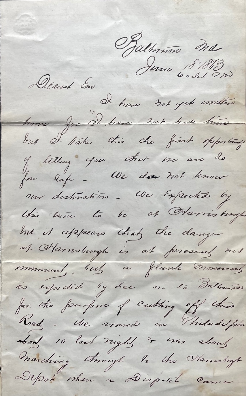 I have not yet written home for I have not had time but I take this the first opportunity of letting you [know] that we are so far safe. We do not know our destination. We expected by this time to be at Harrisburg but it appears that the danger at Harrisburg is at present not imminent, but a flank movement is expected by Lee into Baltimore for the purpose of cutting of this road.