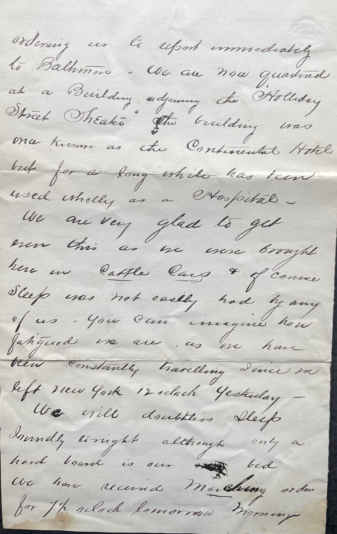 We arrived in Philadelphia about 10 last night & was about marching through to the Harrisburg Depot when a dispatch came ordering us to report immediately to Baltimore. We are now quartered at a building adjoining the Holliday Street Theatre. The building was once known as the Continental Hotel but for a long while has been used wholly as a hospital. We are very glad to get even this as we were brought here in cattle cars & of course sleep was not easily had by any of us. You can imagine how fatigued we are as we have been constantly traveling since we left New York 12 o’clock yesterday. We will doubtless sleep soundly tonight although only a hard board is our bed.