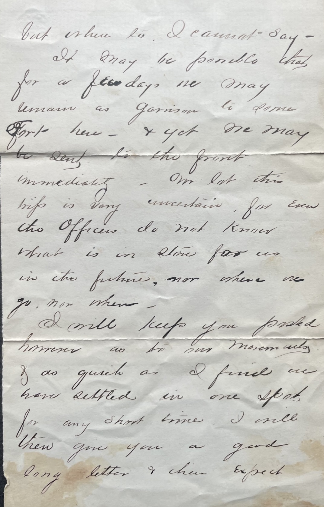 I will keep you posted, however, as to our movements and as quick as I find we have settled in one spot for any short time. I will then give you a good long letter and then expect an answer. But do not write to me now as I cannot tell where we may be.