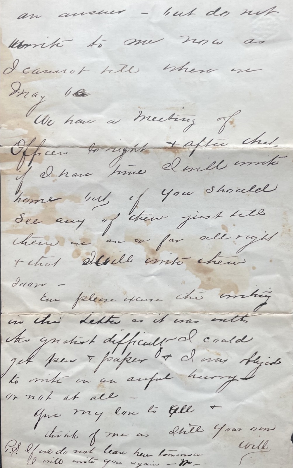 We have a meeting of officers tonight & after that if I have time, I will write home but if you should see any of them, just tell them we are so far all right & that I will write them soon.Em, please excuse the writing in this letter as it was with the greatest difficulty I could get pen & paper & I was obliged to write in an awful hurry, or not at all. Give my love to all. Think of me as still your own, — Will