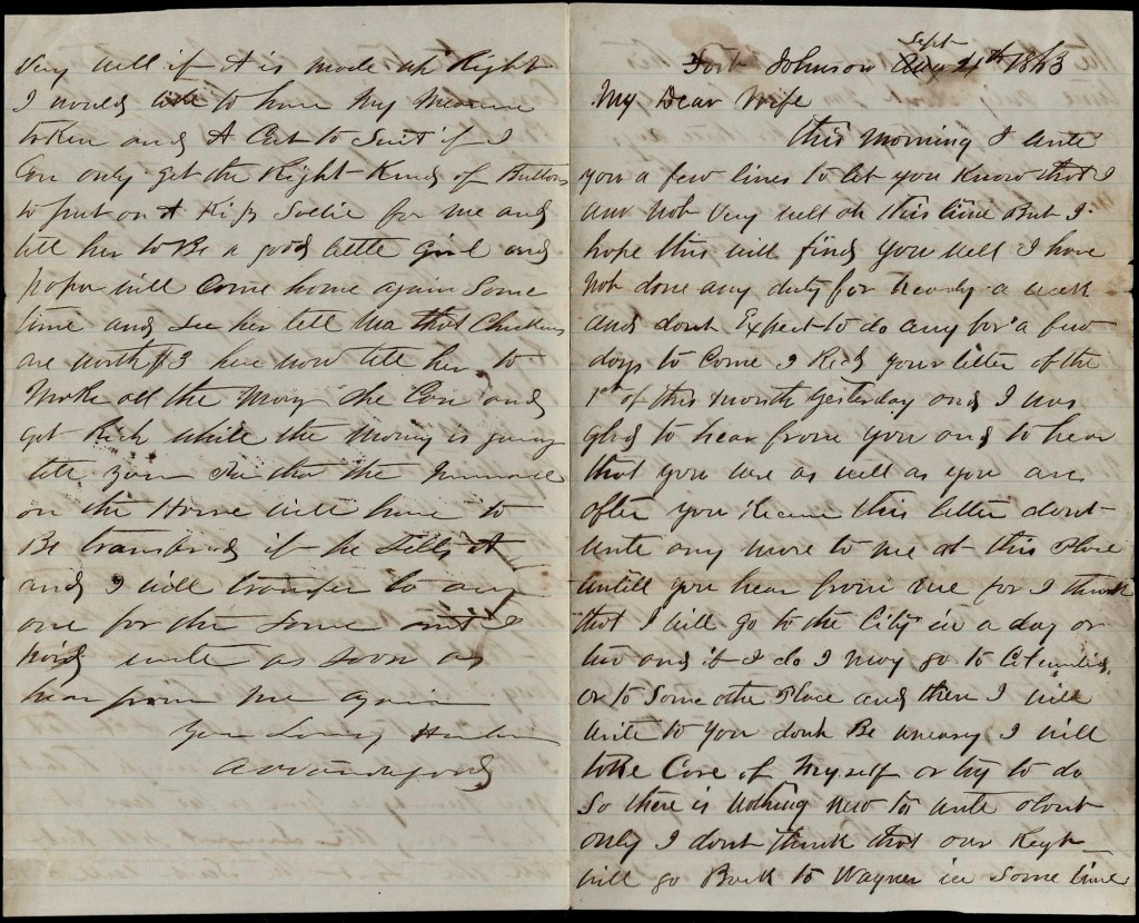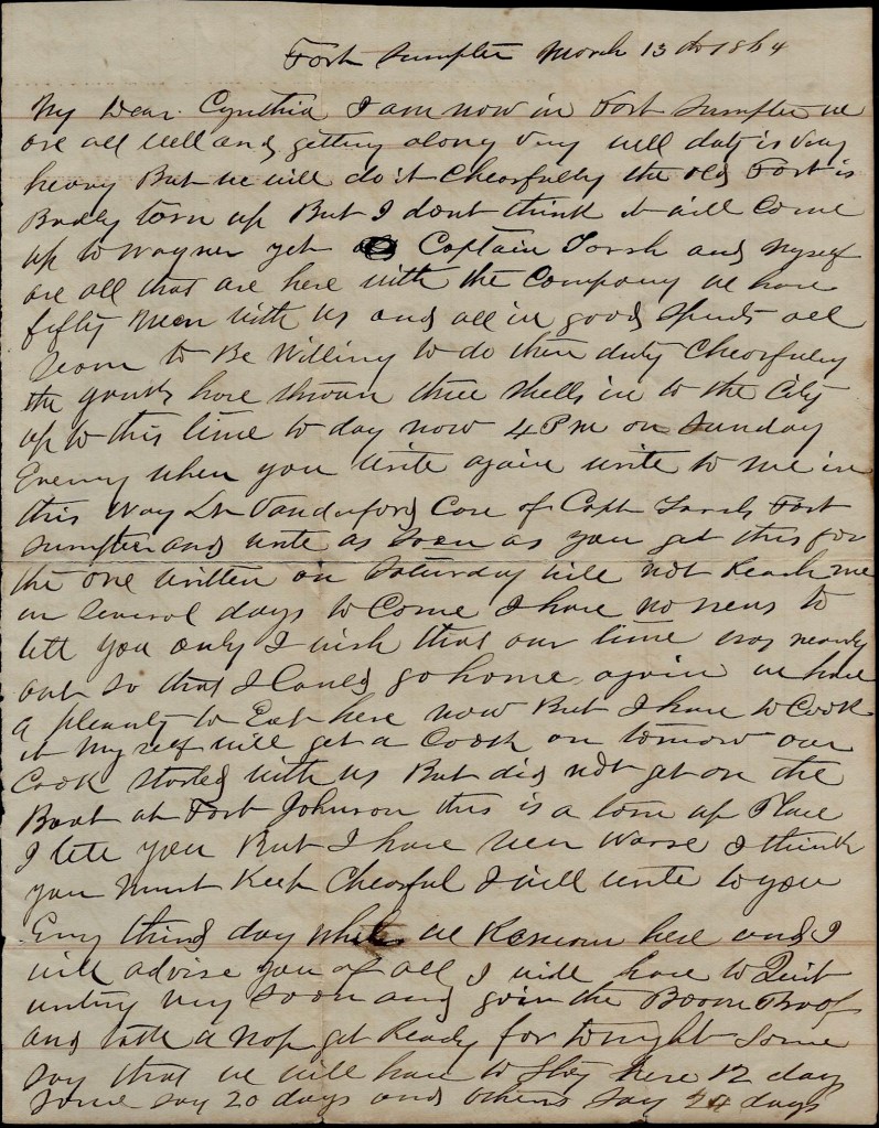 I will write you a few lines to let you know that I am well and I hope this may find you and the baby the same and all of the rest. My dear, I have a hope to write if the Yankees would let me write it. I am in Fort Sumter and so is Dennis and W[illiam] H[enry] [Little] 1 and L. Cliett. We all volunteered to defend it. The Yankees shell it day and night with four hundred pounders. The fort is tore all to pieces and not a gun on it for service. I don’t sleep day nor night. 2 Last night, six monitors come up and shell us all night with shells fifteen inches through but no one got hurt.