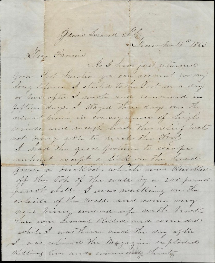 As I have just returned from Fort Sumter you can account for my long silence. I started to the fort in a day or two after I wrote and remained fifteen days. I stayed three days over the usual time in consequence of high winds and rough seas, the relief boats not being able to reach the fort.