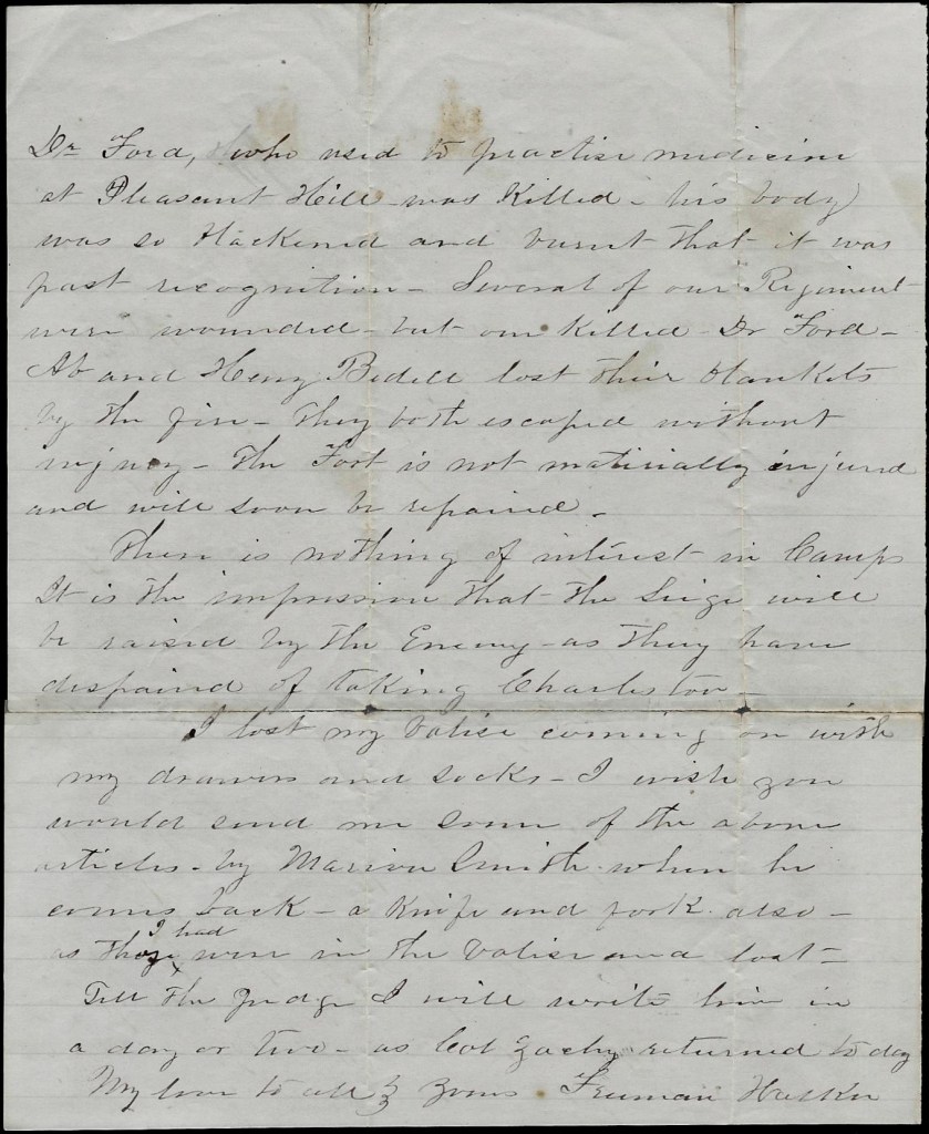 I had the good fortune to escape unhurt except a lick on the head from a brickbat which was knocked off the top of the wall by a 200 pound parrot shell. I was walking on the outside of the wall and come very near being covered up with brick. There were several killed and wounded while I was there and the day after I was relieved, the Magazine exploded killing ten and wounding thirty. Dr. [J. T.] Ford, who used to practice medicine at Pleasant Hill was killed. His body was so blackened and burnt that it was past recognition. Several of our regiment were wounded, but [only] one killed—Dr. Ford. Ab[ner] and Henry Bedell lost their blankets by the fire. They both escaped without injury. The fort is not materially injured and will soon be repaired. 1