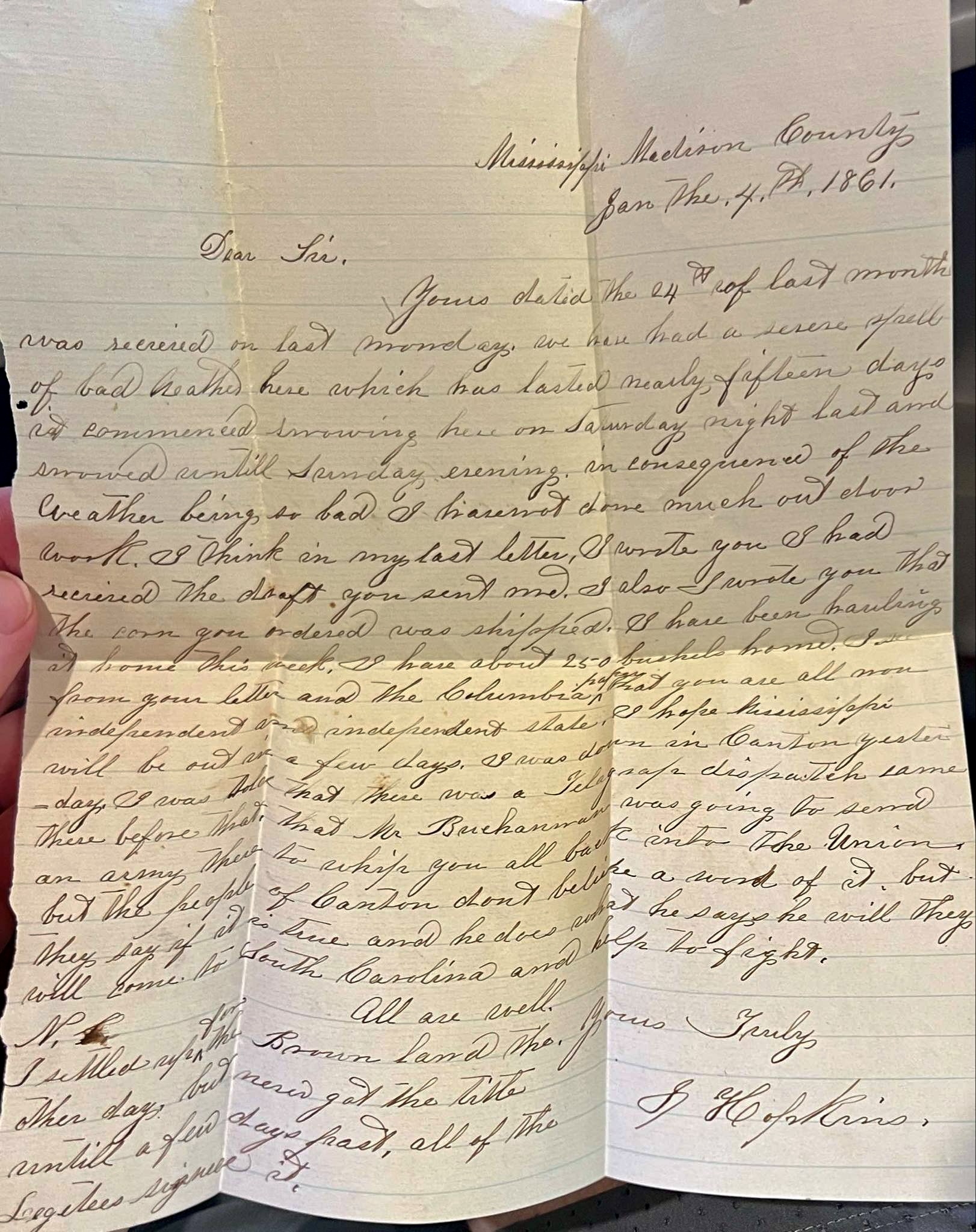 I see from your letter and the Columbia papers that you are all now independent—an independent state. I hope Mississippi will be out in a few days. I was down in Canton yesterday. I was told that there was a telegraph dispatch [received] there before that Mr. Buchanan was going to send an army there to whip you all back into the Union but the people of Canton don’t believe a word of it. But they say if it is true and he does what he says he will, they will come to South Carolina and help to fight. All are well. Yours truly, — J. Hopkins