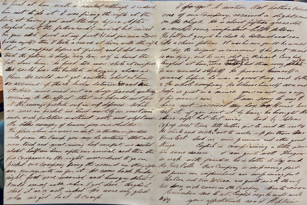 Orders were read out on dress parade yesterday evening to the effect that we should not fire at the enemy’s pickets—only in self defense. While we were on picket, we lived mostly on roast corn and Irish potatoes without salt, and slept under the blue canopy of heaven for our shelter. The place where we were on duty is thirteen or fourteen miles from this camp. You may be certain that all were tired and a great many had sore feet. We rested about half an hour after our arrival and then the five companies on the right were ordered to go on picket, our company being the second on the right was, consequently, in for it. We came back Friday night, foot sore, wearied, and hungry sure! I could scarcely walk when I got here. English stood it very well indeed! We were very glad when we got back to camp.