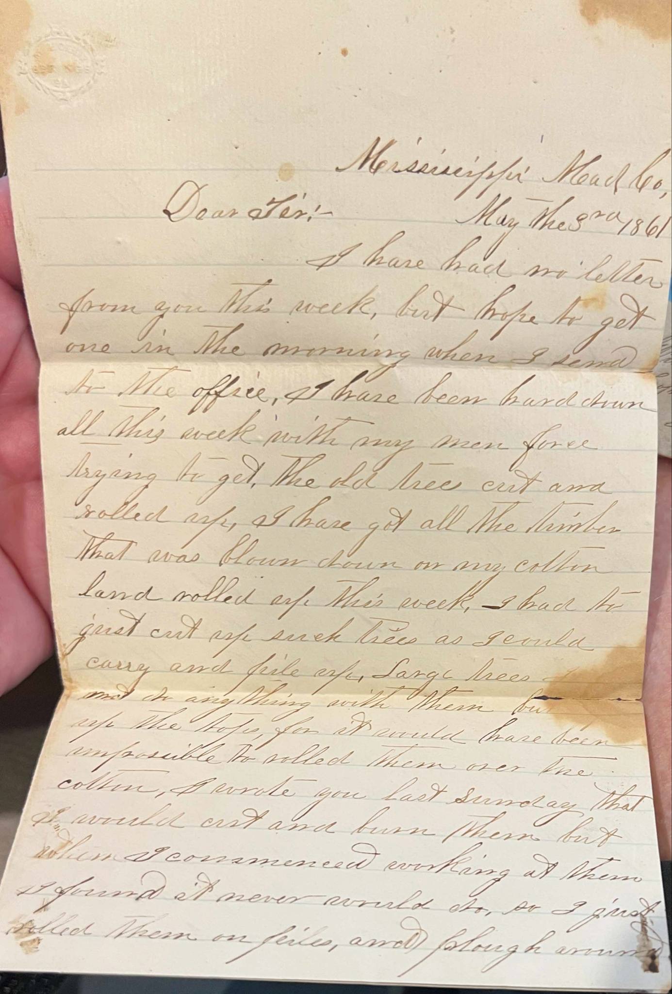 I have had no letter from you this week but hope to get one in the morning when I send to the office. I have been hard down all this week with my men force trying to get the old trees cut and rolled up. I have got all the timber that was blown down on my cotton land rolled up this week. I had to just cut up such trees as I could carry and pile up. Large trees I cannot do anything with them but cut up the tops for it would have been impossible to rolled them over the cotton. I wrote you last Sunday that I would cut and burn them but when I commenced working at them I found it never would do, so I just rolled them on piles and plough around them the best I could. It will take me another week with my men to get the timber piled so I can do anything with them. There is some places in the land that I cleared last winter that I cannot do anything with in consequence of so much timber being on it.