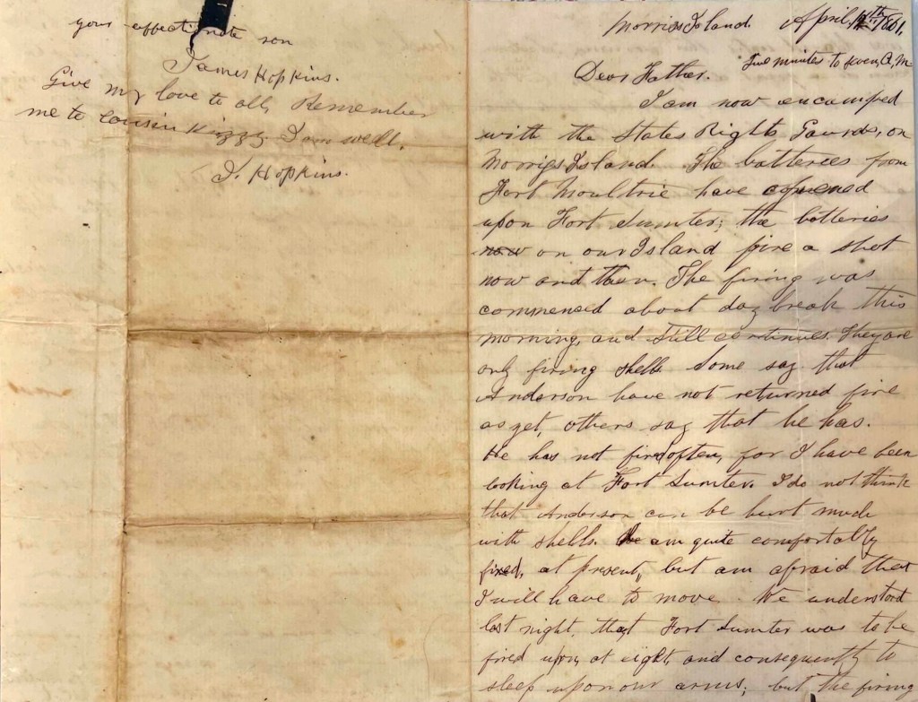 I am now encamped with the States Rights Guards on Morris Island. The batteries from Fort Moultrie have opened upon Fort Sumter. The batteries on our Island for a shot now and then. The firing was commenced about daybreak this morning and still continues. They are only firing shells. Some say that Anderson have not returned fire as yet. Others say that he has. He has not fired often for I have been looking at Fort Sumter. I do not think that Anderson can be hurt much with shells. I am quite comfortably fixed, but am afraid that I will have to move. We understood last night that Fort Sumter was to be fired upon at eight and consequently to sleep upon our arms, but the firing was delayed until this morning. Anderson can do a great deal of damage but he seems to treat our firing with silent contempt—at least so far. I have to stop now. I am called to arms. Direct to me at Morris Island, States Rights Guards. — J. Hopkins (wrong direction, you will see the right directions at the end of the letter)