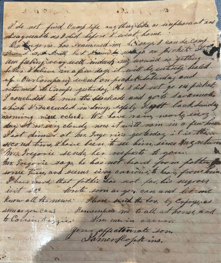 We have rain nearly every day. It is very cloudy now. It will rain in few hours. I eat dinner at Mr. Gregorie’s yesterday. It is the second time I have been to see him since my return. Mrs. Gregorie sends her respects to you. Mr. Gregorie says he has not heard from father for some time and seems very anxious to hear from him. I have heard that Father has sent for his negroes. Is it so? Write soon as you can and let e know all the news. Please send the box by Express as soon as you can. Remember me to all at home and to Cousin Kizzie. I remain as ever, your affectionate son, — James Hopkins