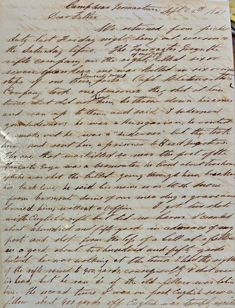 We returned from picket duty last Friday night, being out ever since the Saturday before [Sept. 14-20]. The Lancaster Greys [Co. A], the rifle company on the right of our regiment, killed six or seven Yankees. One was killed in six or eight steps of one of their (Lancaster Greys) posts. Capt. Whitworth’s Company [Co. C] took one prisoner. They shot at him twice but did not hit him. He threw down his arms and ran up to them and said, “I Suderner, you Suderner.” He was a Hungarian. He wanted to make out he was a “suderner” but they took him and sent him a prisoner to Headquarters. The one that was killed so near the post of the Lancaster Greys was a Vermonter. He lived about two hours after he was shot, the bullet going through him, breaking his backbone. He said his name was W. A. Snow 1 from Vermont. Some of our men dug a grave and buried him without a coffin.