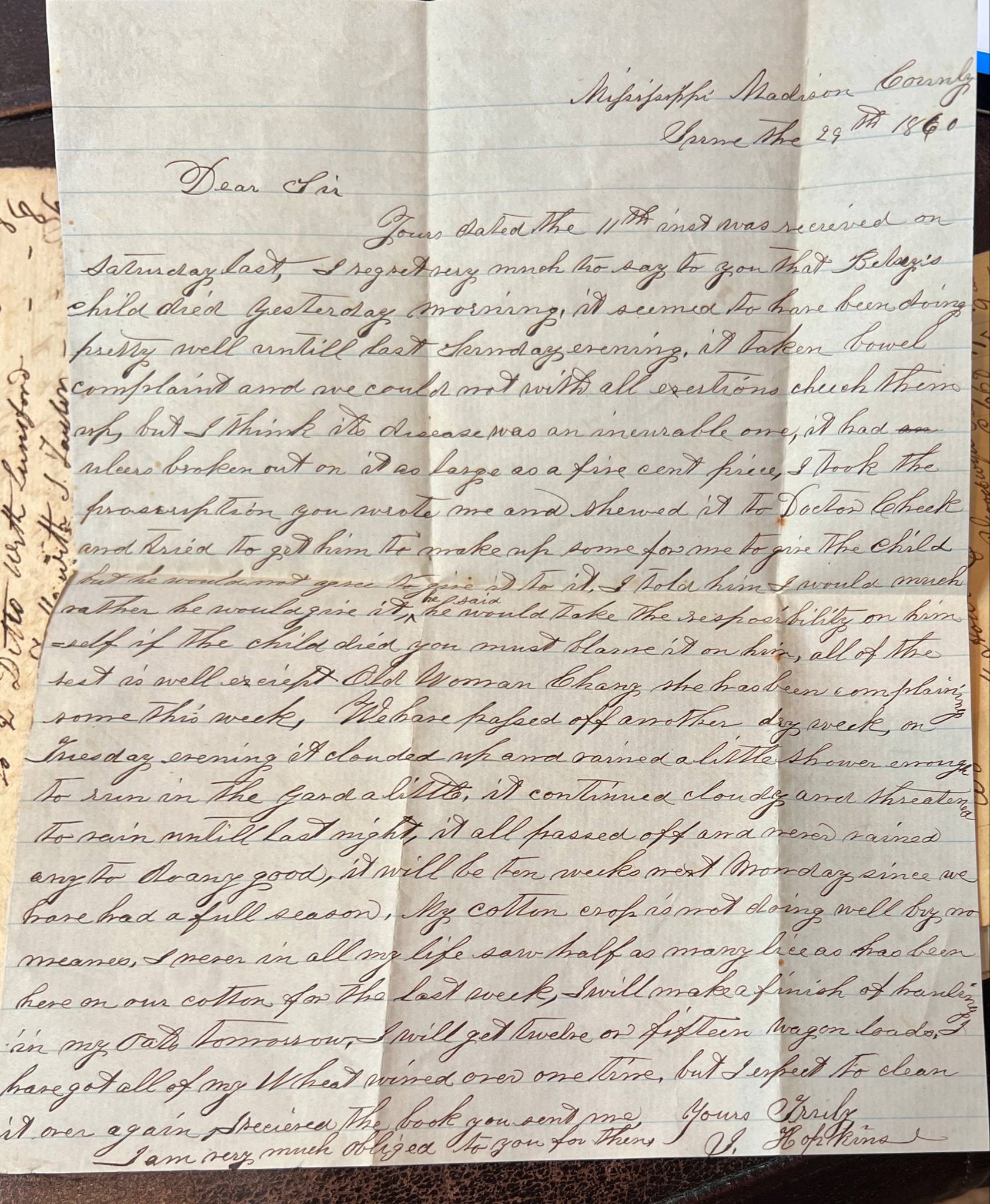 Yours dated the 11th inst. was received on Saturday last. I regret very much to say to you that Betsy’s child died yesterday morning. It seemed to have been doing pretty well until last Sunday evening. It taken bowel complaint and we could not with all exertions check them up. But I think its disease was an incurable one. It had ulcers broken out on it as large as a five cent piece. I took the prescription you wrote me and showed it to Doctor [William Alston] Cheek 1 and tried to get him to make up some for me to give the child but he wouldn’t agree to give it to it. I told him I would much rather he would give it. He said he would take the responsibility on himself if the child died. You must blame it on him. All of the rest is well except Old Woman Chany. She has been complaining some this week.