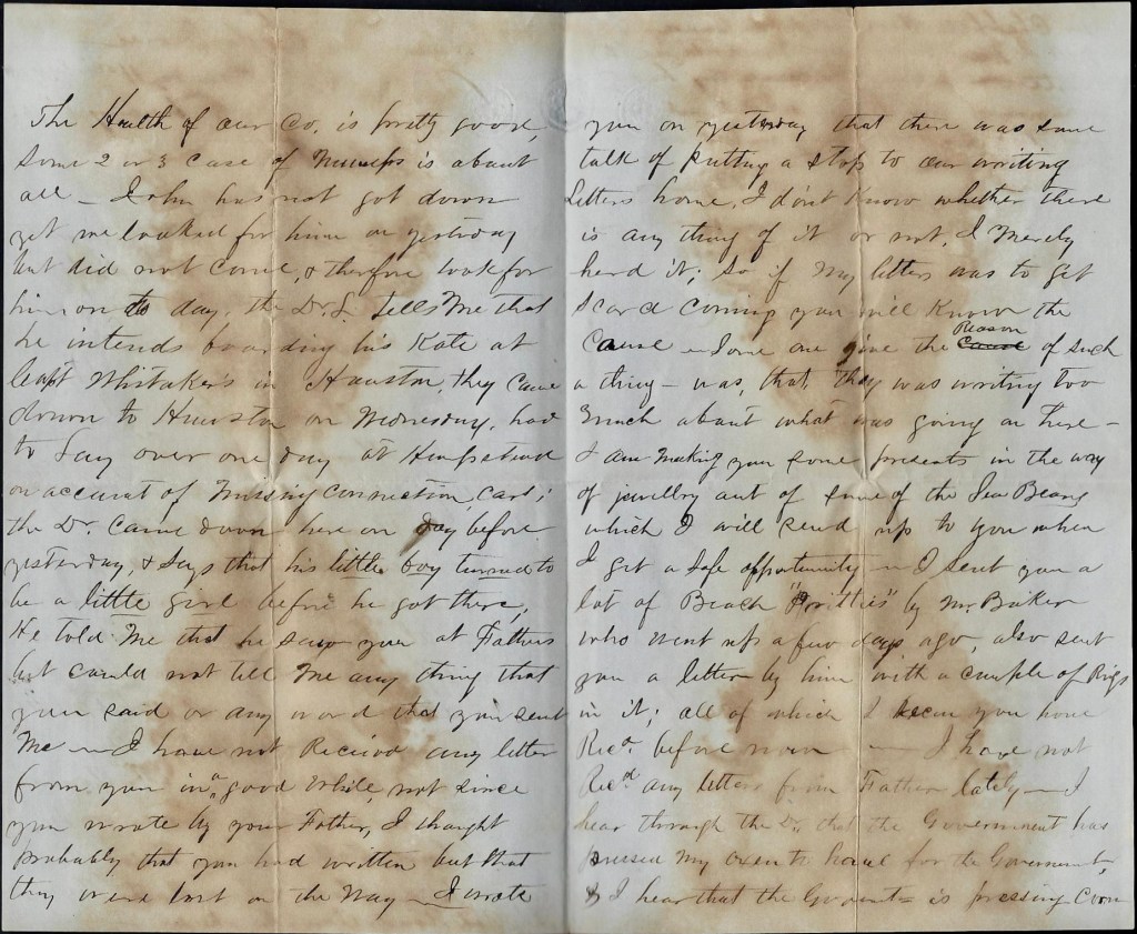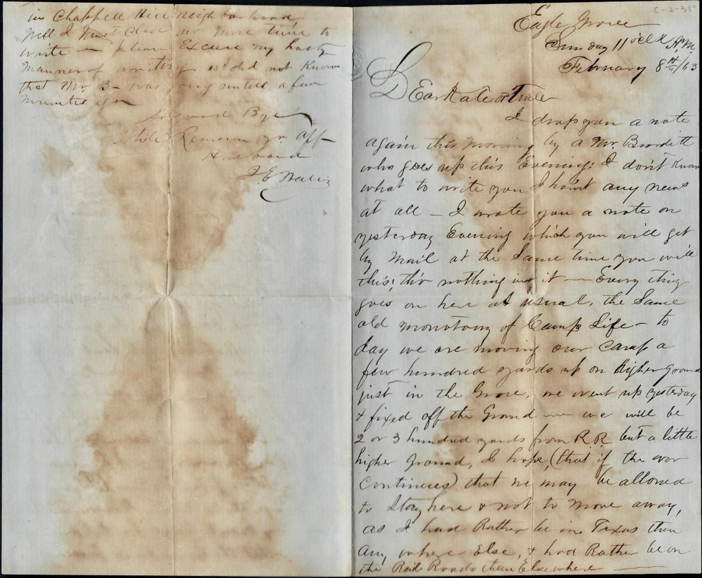 Our company is now camped at Harrisburg, about 7 miles this side of Houston; most of the balance of the regiment is at Eagle Grove on this Island, & about 5 or 6 miles from the city. I cannot tell how long my services will be required in this office. It will depend upon circumstances. I have at present a good deal of writing to do, & if it continues, I shall remain at Head Quarters permanently. You can direct your letters as usual. When they reach the regiment, the adjutant, who receives them, knows where I am and sends them to me. The other letter to which you allude as having written to me has not yet come to hand but I am hoping to receive it soon. Write as often as circumstances admit of & let this request be a standing one. Tell papa Johnson that making corn, tanning leather, & raising tobacco will be doing more good for the Confederacy than by fighting for it, as he is too old and feeble for this kind of life.
