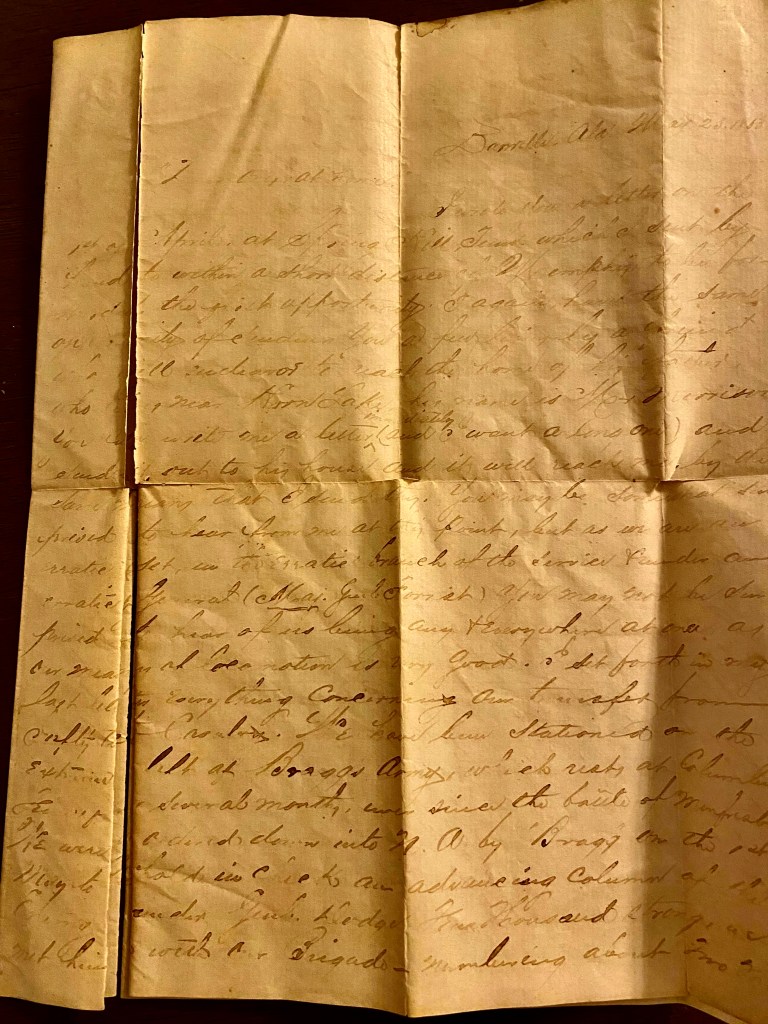 You may be somewhat surprised to hear from me at this point, but as we are an erratic set in the erratic branch of the service & under an erratic General (Maj. Gen. Forrest), you may not be surprised to hear of us being any and everywhere at once as our means of locomotion is very good. I set forth in my last letter everything concerning our transfer from infantry to cavalry.