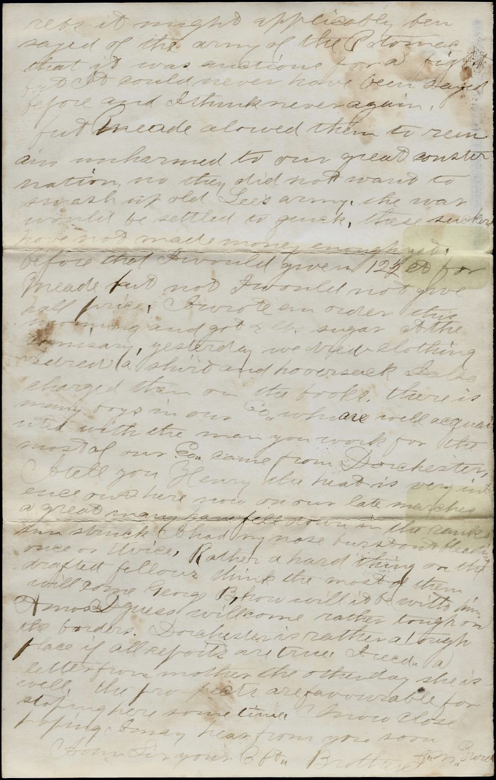 Genl. Meade is very much put out at Burnside, blaming him in part for the failure of the last assault. Do not mention this to anyone as I do not like to circulate these stories. Burnside was here all day yesterday before the Court Martial of the telegraph operators, but did not go near General Meade.