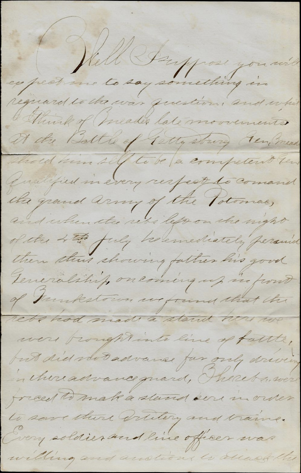 The papers are bound to have Gen’l. Pleasanton as the next commander of this Army. It is very amusing to those who know him. He is the last man fit to command an Army and the mention of his name is absurd. Gen’l. Meade has shown himself an able Commander and I hope for the good of the country, no change will be made. He has a splendid eye for the topography of country and acts always quick and with decision. I know we have no one so capable of filling his place so far as I personally am concerned. His removal might be beneficial as I might then be able to have you with me. But I still trust for some good luck befalling us. I would be too happy for anything if I only could have you with me this winter.