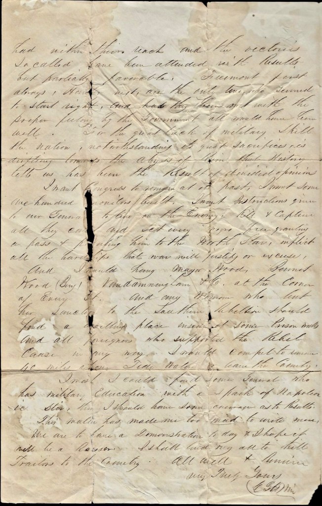 I wish I could find some general who has military education with a spark of Napoleonic stir. Then I should have some courage as to results. This matter has made me too mad to write more. We are to have a demonstration today & I hope it will be a rouser. I shall lend my all to kill traitors to the country. All well & remain very truly yours, — C. G. Coffin