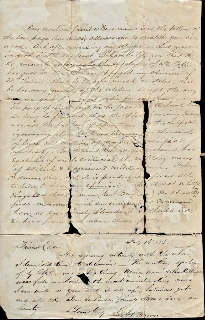 Our mutual friend whose name is at the bottom of the last page has kindly allowed me to scratch you one work after expressing my satisfaction that you are in good health and heart, I have to tell you that I do sincerely subscribe to the substance of all Coffin has just written. I have changed my opinion of McClellan. Think he has been much overrated, that he has every quality of the soldier except the very one we gave him most credit for—viz: General. The proof of this I find in the fact that it took him so long to find out that the Chickahominy Swamp was not the best base of operations. By this culpable ignorance, there has been thousands on thousands of lives and millions of property scarified needlessly. But I think I hear you exclaim, how egotistic of me to criticize the military moves of skilled & experienced military men. Perhaps I deserve this, but it is pardonable for us all to have an opinion. Is it not a little singular that the man (General Benham) should in his first movement with an independent command have so egregiously blundered. I should like to hear from you upon these points.