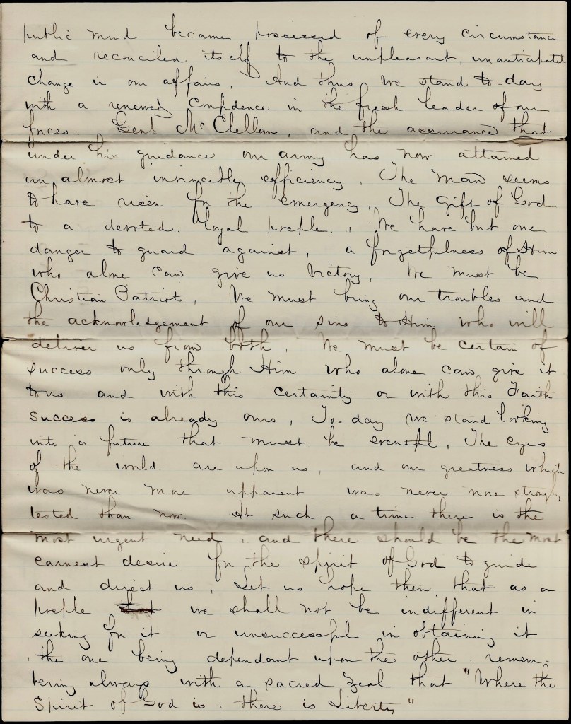 Though it can’t be pinned to a specific hand, this essay vividly encapsulates the turmoil rippling through the Northern states from the moment the shots rang out over Fort Sumter until the rise of Gen. McClellan—who is described as “the gift of God to a devoted, loyal people.” Such language perfectly encapsulates the anxiety and fervor of the times, and invokes the belief that calamity will only befall a Nation that does not place its trust in God.