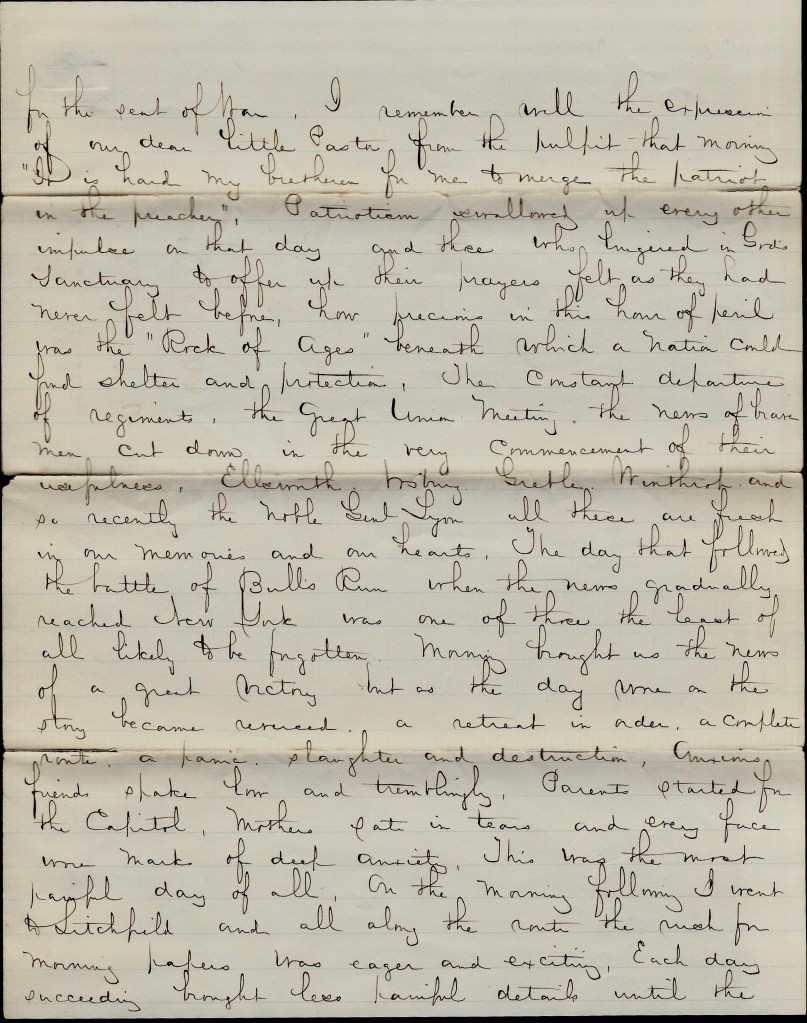 The day that followed the battle of Bull’s Run when the news gradually reached New York was one of those the least of all likely to be forgotten. Morning brought us the news of a great victory but as the day come on, the story became reversed, a retreat in order, a complete rout, a panic, slaughter and destruction, anxious friends spoke low and tremblingly. Parents started for the Capitol. Mothers sat in tears and every face wore marks of deep anxiety. This was the most painful day of all. On the morning following I went to Litchfield and all along the route the sush for morning papers was eager and exciting. Each day succeeding brought less painful details until the public mind became possessed of every circumstance and reconciled itself to the unpleasant, unanticipated change in our affairs. And thus we stand today with a renewed confidence in the fresh leader of our forces, General McClellan, and the assurance that under his guidance, our army has now attained an almost invincible efficiency. The man seems to have risen for the emergency—the gift of God to a devoted, loyal people.