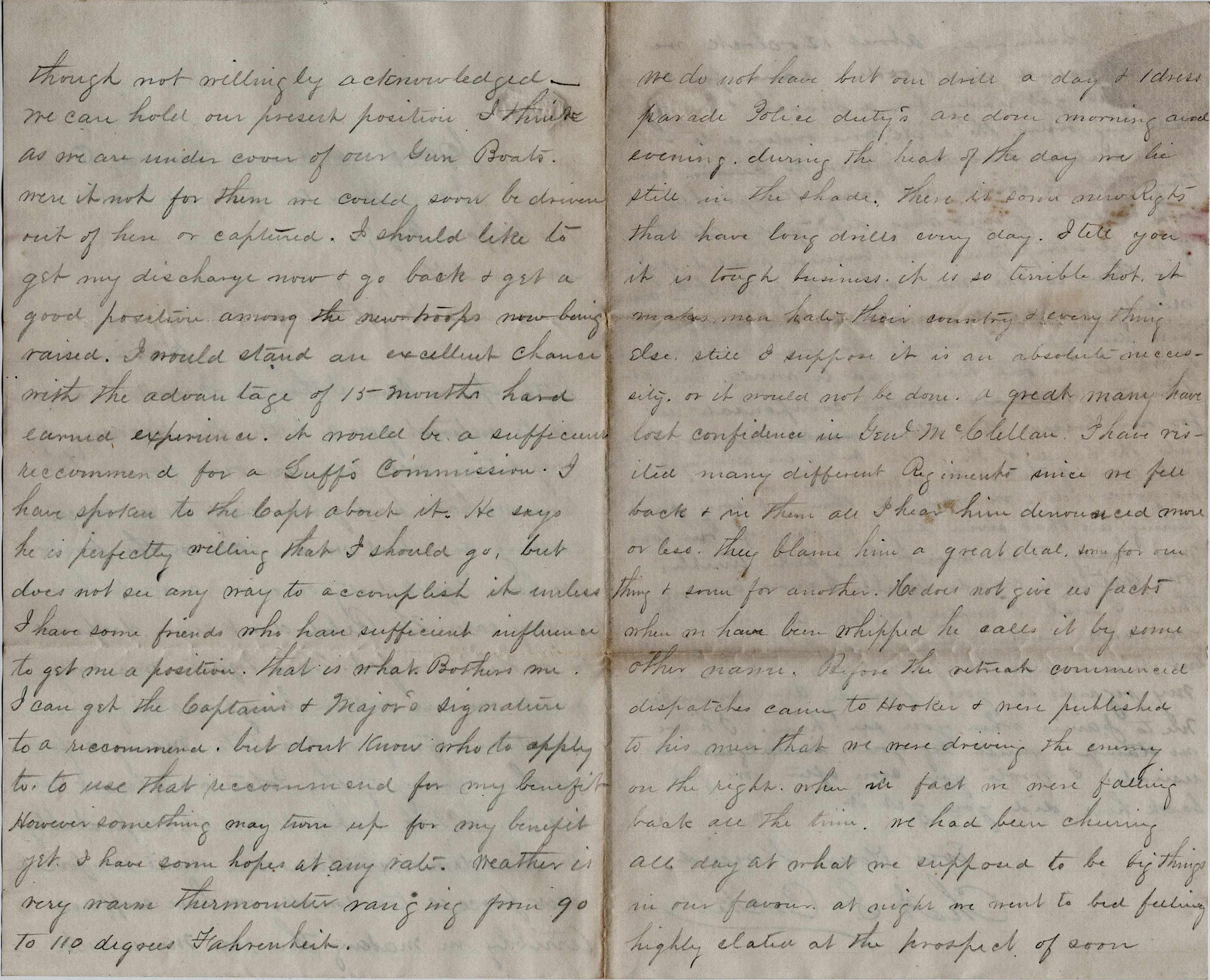 A great many have lost confidence in General McClellan. I have visited many different regiments since we fell back & in them all I hear him denounced more or less. They blame him a great deal, some for one thing & some for another. He does not give us facts when we have been whipped. He calls it by some other name. Before the retreat commenced, dispatches came to Hooker & were published to his men that we were driving the enemy on the right when in fact we were falling back all the time. We had been cheering all day at what we supposed to be big things in our favor. At night we went to bed feeling highly elated at the prospect of soon being in Richmond. About 12 o’clock we were all called up & orders came for every man to get ready for a march & in light marching order. The sick ones were ordered to start immediately & we were ordered to destroy everything that we could not carry—knapsacks, tents, & even guns were destroyed, clothing of every description were burned instead of giving them to the men when half of them were nearly naked. Ammunition & subsistence were destroyed all along the lines the amount of which no one has dared to make an estimate. Millions wouldn’t compensate us for our losses. These stores did not fall into the hands of the rebels but were destroyed—that is, the most of them.