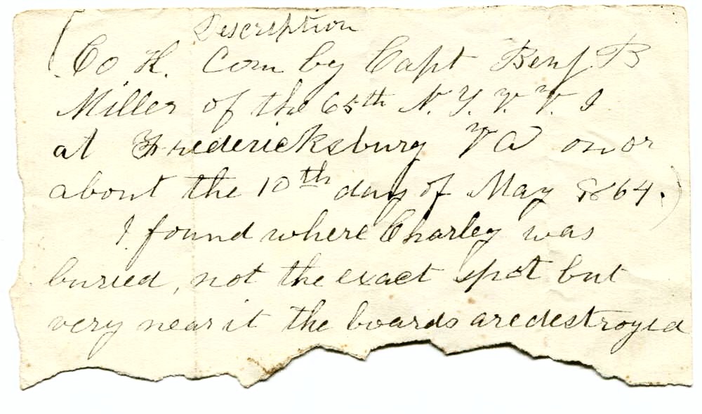 These letter was written by Pvt. Charles S. Crockett (1838-1864) of Co. K, 65th New York Infantry (a.k.a. the 1st U.S. Chasseurs). The regiment was primarily raised in New York City, but also recruited in Connecticut; Seneca, Ohio; and Providence, Rhode Island. Crockett of Company K was from Adams township, Seneca county, Ohio. He was the son of James Crockett (1798-1874) and Mary Parsons Haskell (1801-1874). When he enlisted, he was described as 6 foot 1 inches tall, with blue eyes and dark hair—a farmer. He reenlisted in the regiment in December 1863 but did not survive the war. He died at Fredericksburg from wounds received in the Battle of the Wilderness on 6 May 1864. His death occurred on 10 May 1864.