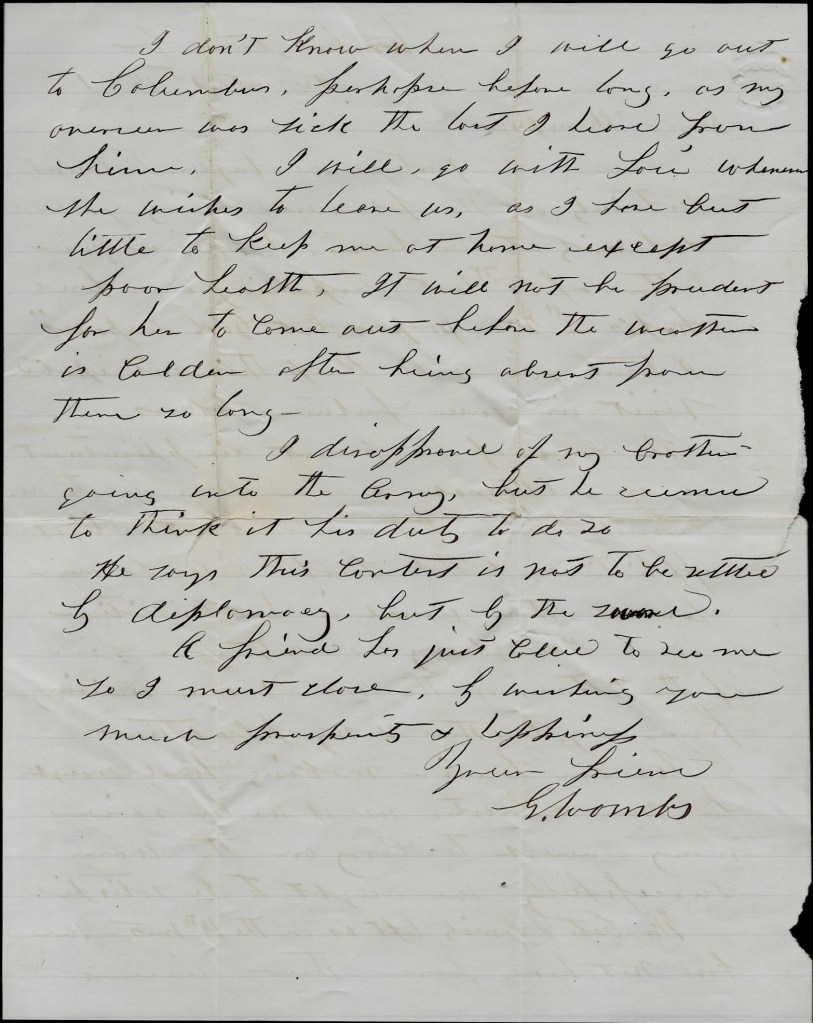 My pen is so miserable I can scarcely write. I must not mind looks though—especially now, so my own darling excuse both the composition and writing. I will supply myself with a new pen next time & hope my brain will be more active. Mrs. Robinson, Inez, Mollie, and Lou all send a great deal of love to you. Do write very soon. Every line from you is a comfort and blessing to me. God bless & keep you my darling and bring you home safe to your own true & loving wife, — Em