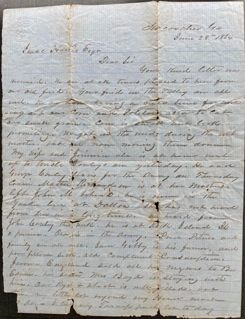 I have been busy all this week making shirts for the society. There is little or no work there now. Mrs. Greene is still in Lee. No one here has heard anything of her since she left. I reckon she will be up here in a few days to stay with us awhile. Yesterday Mrs. Crawford & I went to hear Mr. Clark’s funeral sermon preached. It was very sad.